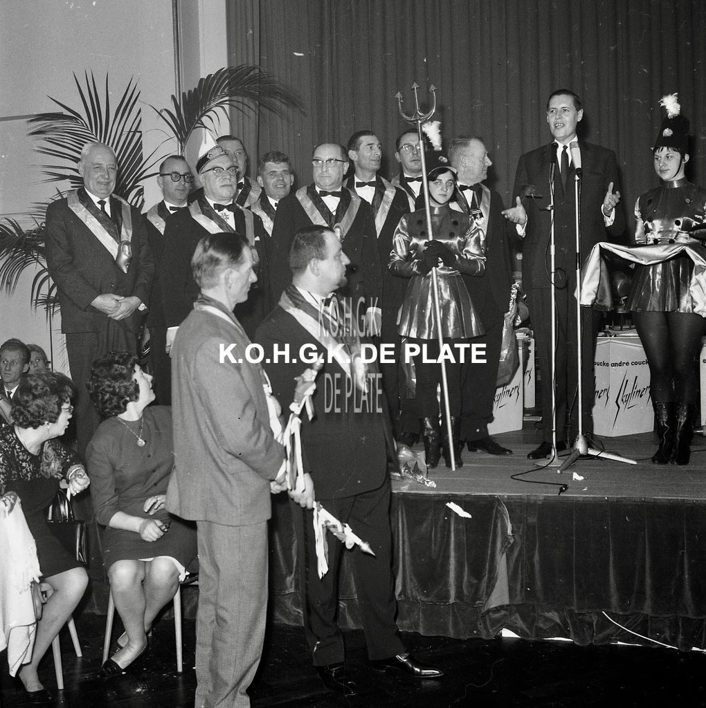 Negatief : 6 x 5,5 cm. - Aanstelling van Cis Ier als Prins Carnaval. Burgemeester Jan Piers houdt zijn toespraak. Links, leden van de "Orde van de Kloeffe", o.a. : vooraan, Gerard Dangreau en achteraan rechts, Fernand Monteny. Hier in het Feest- en Cultuurpaleis.