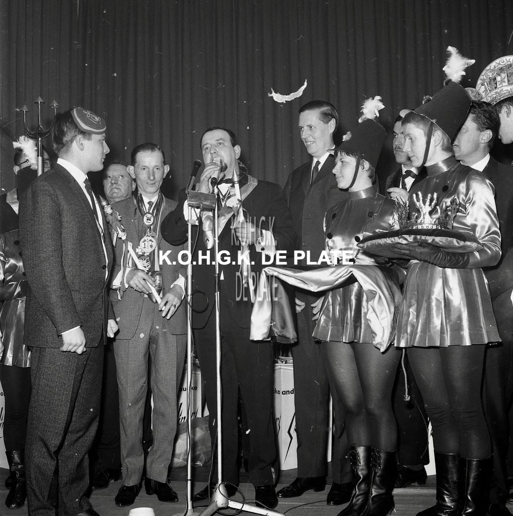 Negatief : 6 x 5,5 cm. - Aanstelling van Cis Ier als Prins Carnaval. Gerard Dangreau van de "Orde van de Kloeffe" houdt zijn toespraak. Rechts, burgemeester Jan Piers. Hiet in het Feest- en Cultuurpaleis.