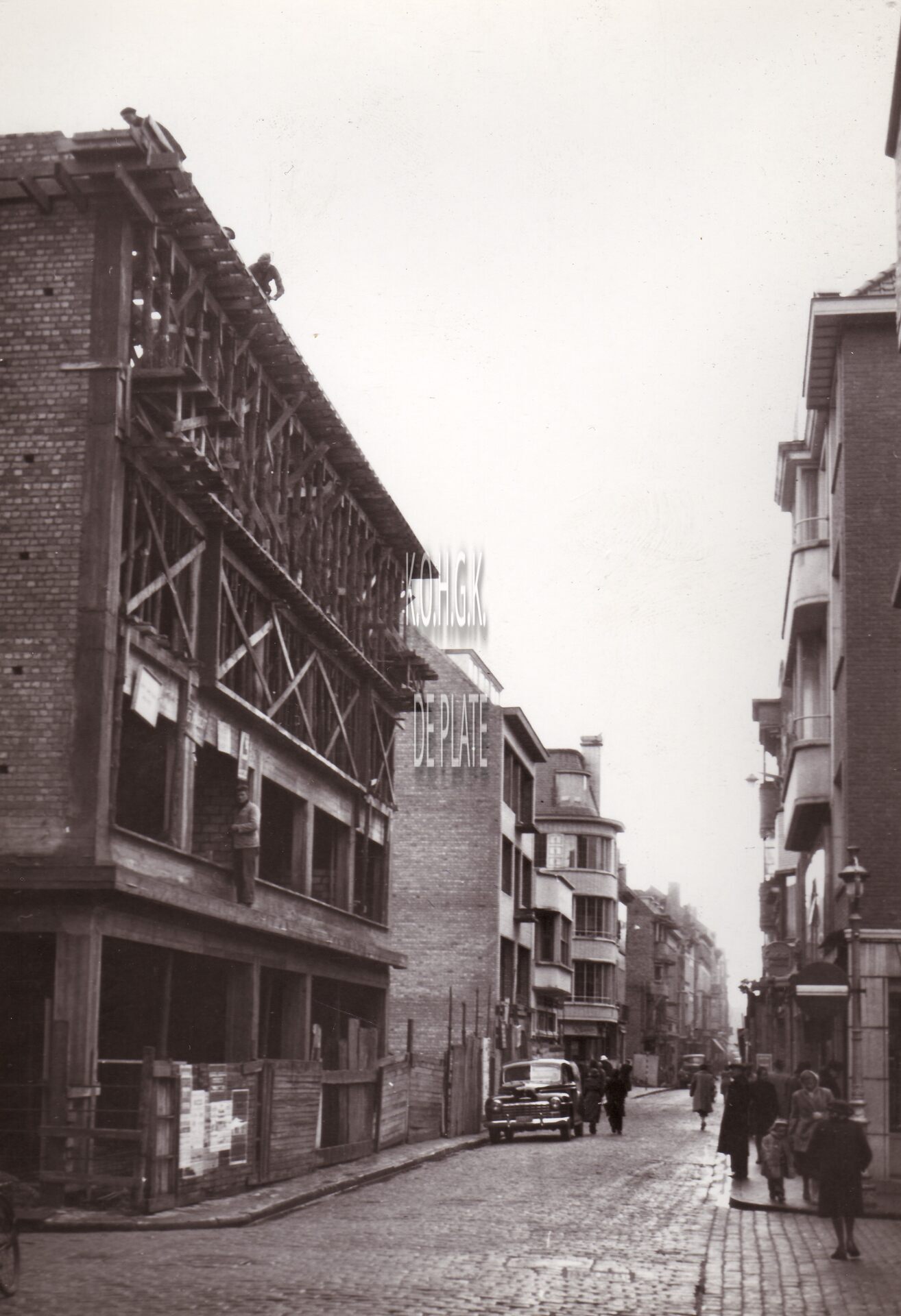 Formaat : 18 x 13 cm. - Bouw van een appartementsgebouw op de hoek van de Kapellestraat en de Witenonnenstraat, met onderaan de toekomstige kledingzaak voor mannen Savelkoul. Plaats van de huidige Inno (2025)