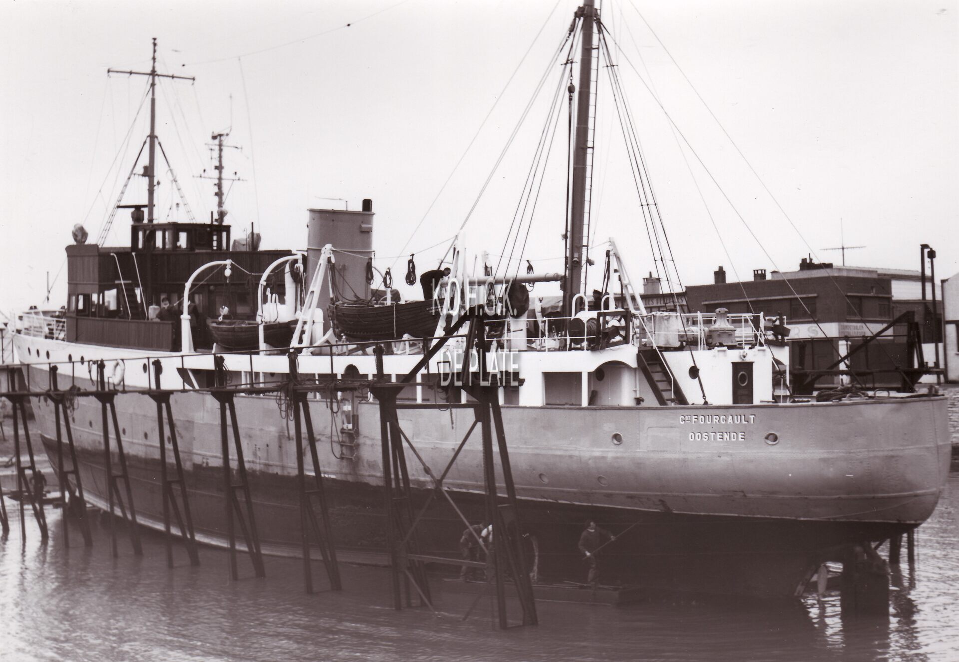 Formaat : 13 x 18 cm. - Het schoolschip voor de rijksmarineschool Commandant Fourcault op de slipway. Men is bezig de kiel te reinigen. Het schip werd in 1937 gebouwd en deed dienst als loodsboot 18. In 1962 werd het volledig herbouwd.