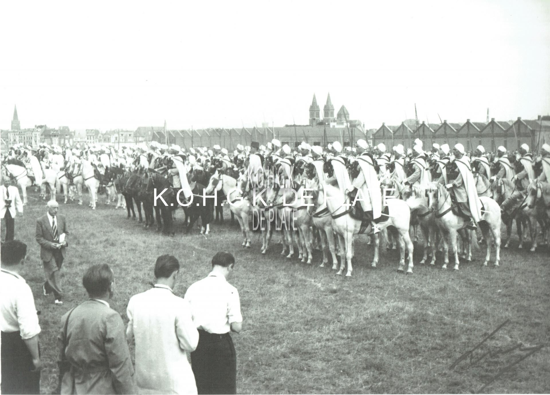 Vergroting. - Formaat : 28 x 40 cm. - In de periode 19-23 juli was er een internationaal "Concours Hippique", met een feest van de Spahis. Een afdeling Noord Afrikaanse ruiters, Spahis, opgesteld op de Wellingtonrenbaan tijdens hun bezoek aan de stad. Op de achergrond de werkhuizen van de N.M.V.B. (Buurtspoorwegen) aan de Nieuwpoortsesteenweg en de Heilig Hart kerk.