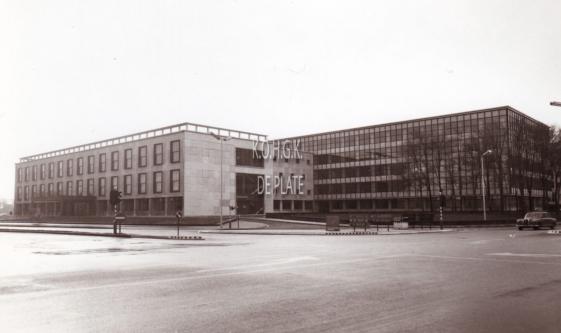 Formaat : 13 x 18 cm. - Gebouwd in de vijftiger jaren naar de plannen van de architecten V. Bourgeois en A. Daniels. Gebouwd door de Algemene Ondernemingen Weduwe J. Van Coillie. Eerste steen in 1956 en volledig in gebruik in 1961