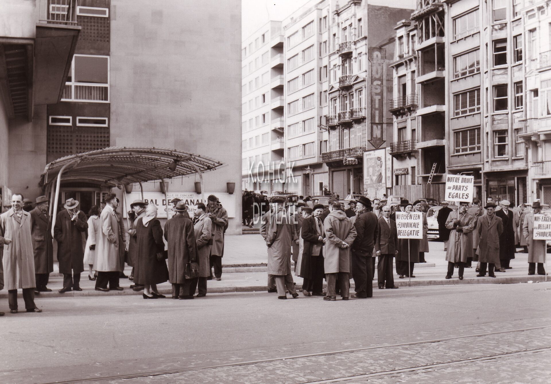 Formaat : 13 x 18 cm. - Stakende spelbedienden aan de ingang van de speelzaal van het Casino-Kursaal. Rechts Kursaal-Oosthelling