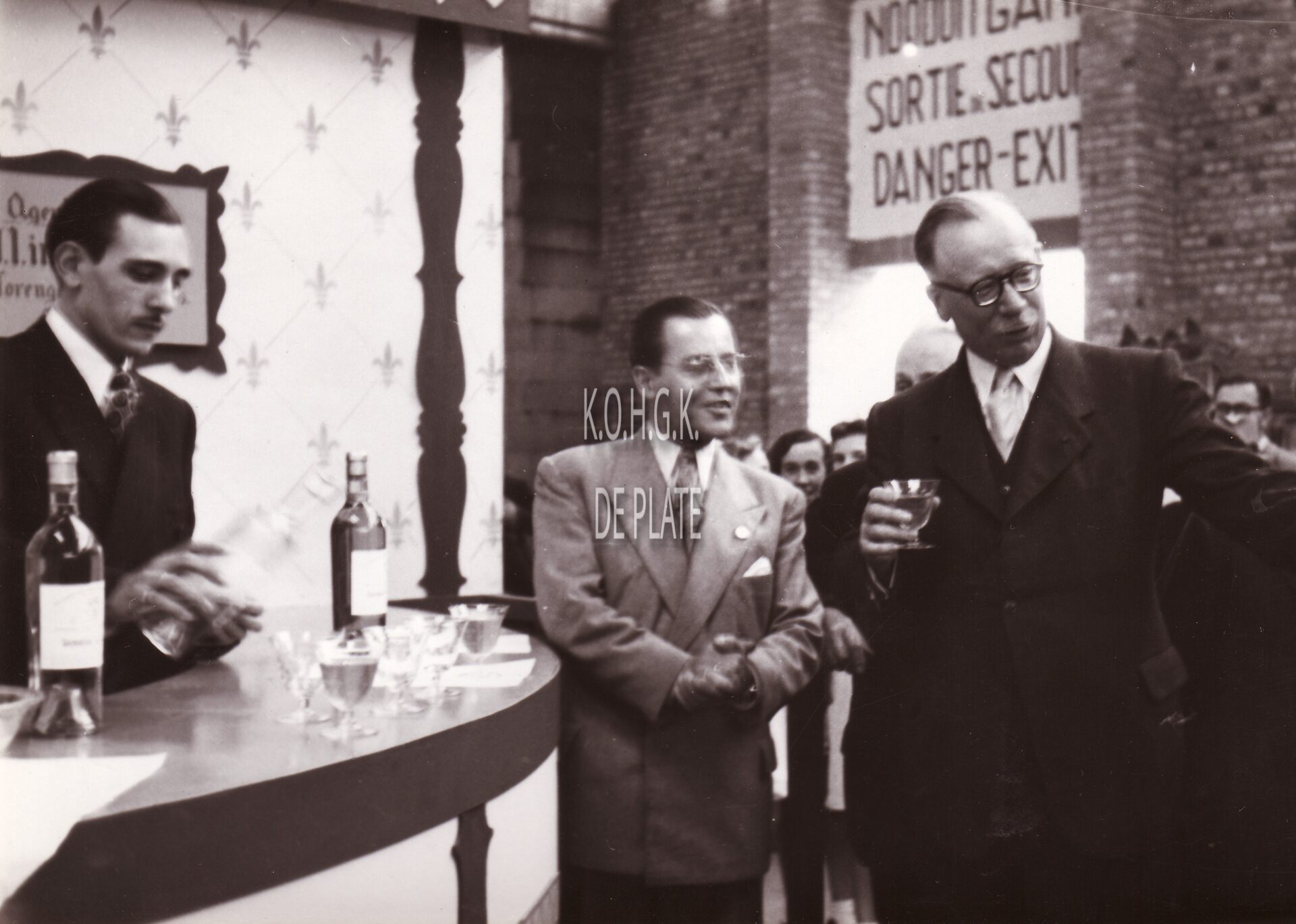 Formaat : 13 x 18 cm. - Burgemeester Hendrik Serruys nuttigt een glaasje aan een stand op de handelsbeurs in de Albert hall van het oud station op het Ernest Feysplein.