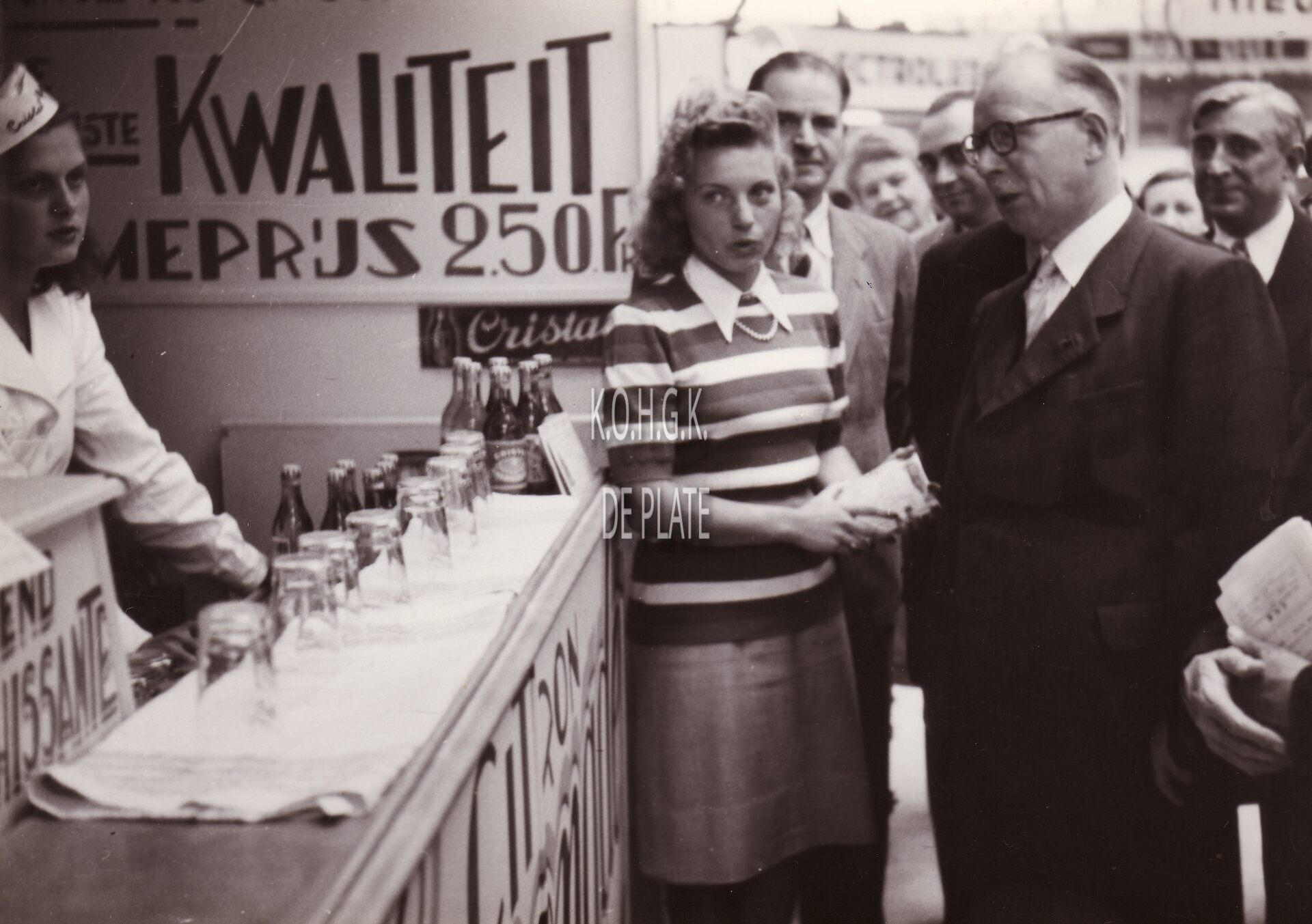 Formaat : 13 x 18 cm. - Burgemeester Hendrik Serruys krijgt uitleg aan een stand op de handelsbeurs in de Albert hall van het oud station op het Ernest Feysplein.