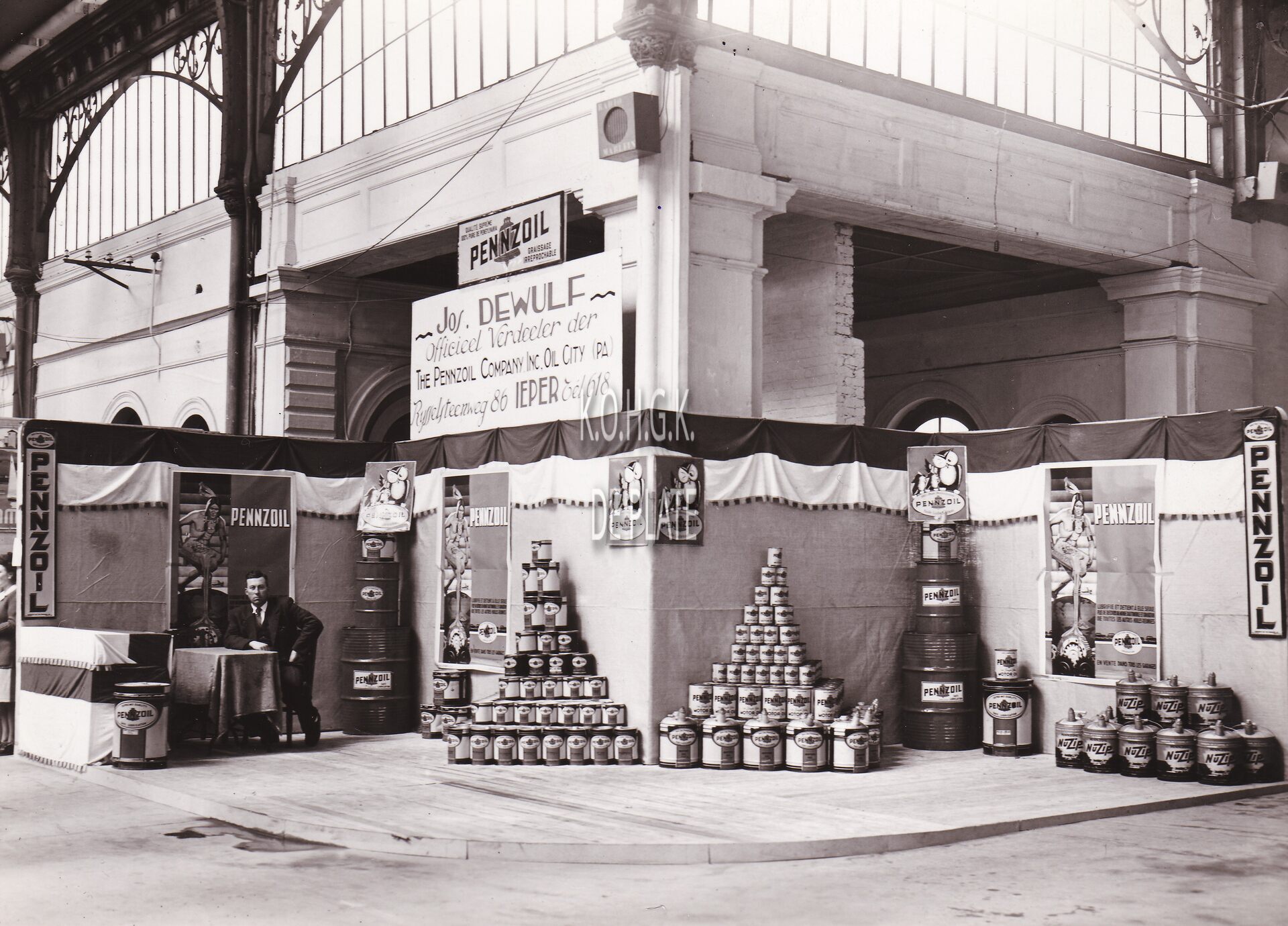 Formaat : 13 x 18 cm. - De stand van de firma Pennzoil, olieproducten, op de handelsbeurs in de Albert hall van het oud station op het Ernest Feysplein.