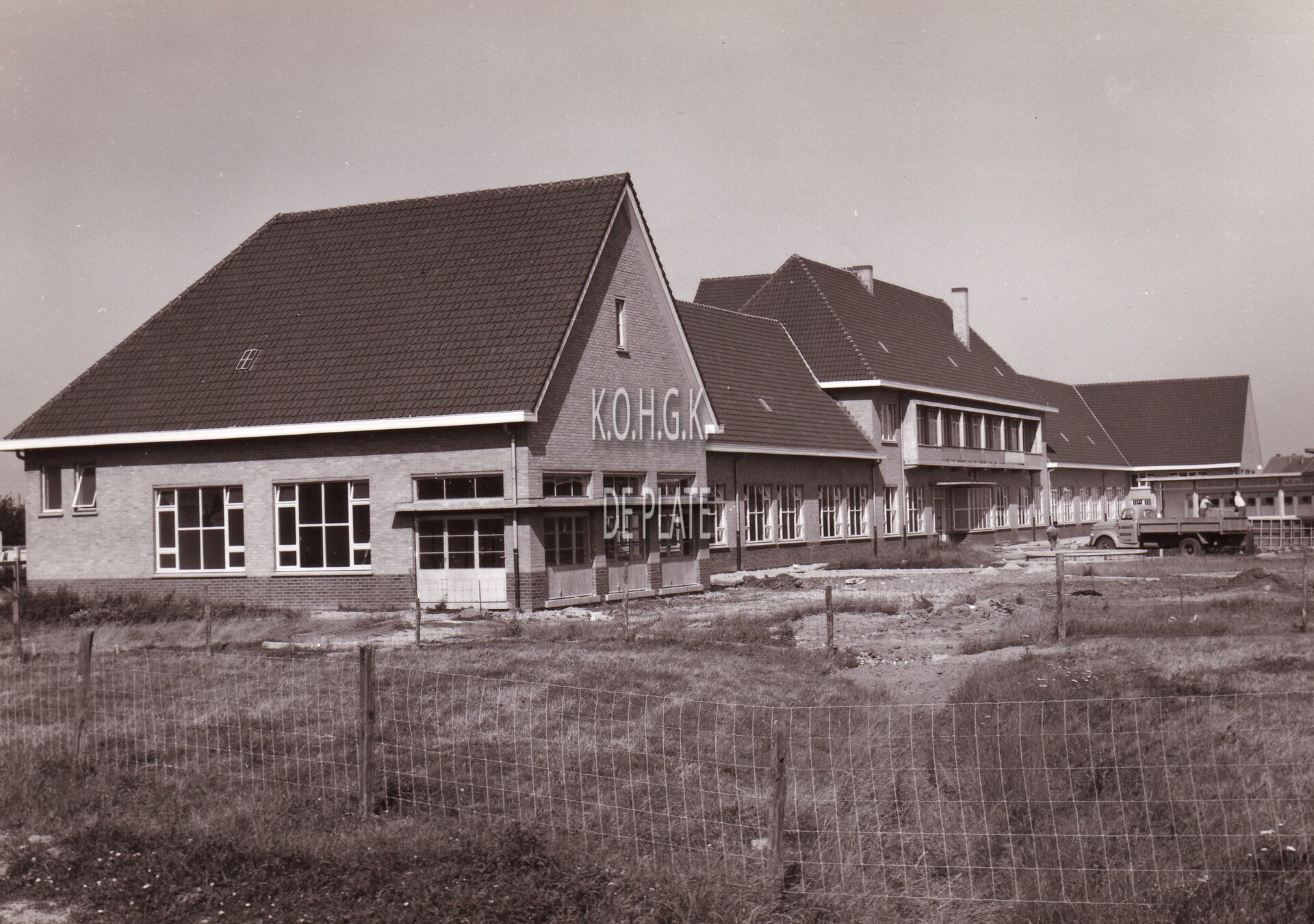 Formaat : 13 x 18 cm. - Gelegen op de wijk Meiboom in de Frère-Orbanstraat (huidige August Vermeylenstraat). Gebouwd naar de plannen van Arnold De Vos door aannemer H. Boudolf. Officiële opening door burgemeester Adolf Van Glabbeke op 27 augustus 1955