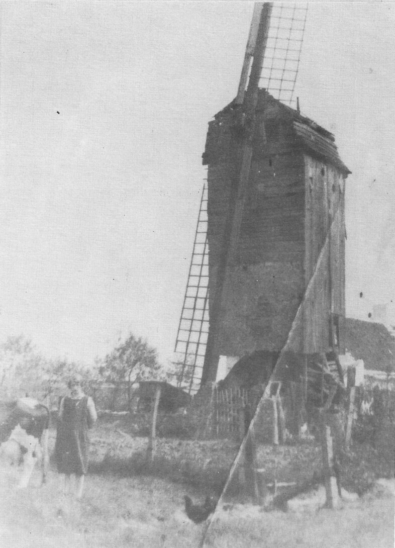 Deze molen werd gebouwd in de 19e eeuw, en was gelegen op de hoek van de Torhoutsesteenweg en de Ledeweg. Deze molen had slechts twee wieken, en werd afgebroken in 1932. Op de foto : Marguerite Sabbe, wonend in het aanpalend huisje