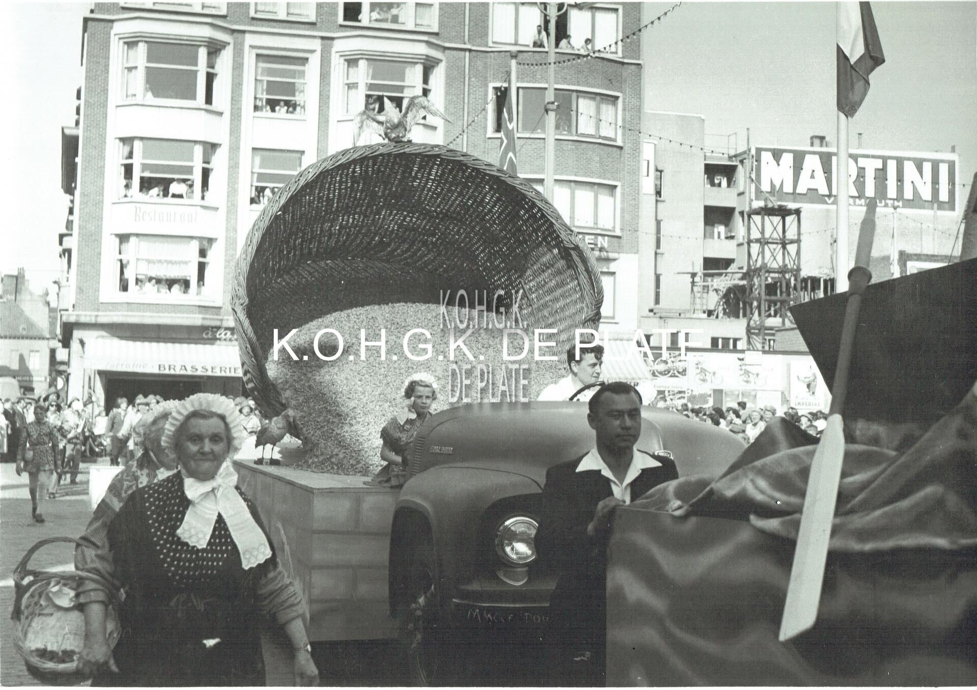 Vergroting. - Formaat : 30 x 40 cm. - Een praalwagen met een "benne" (=mand) gevuld met garnalen in een stoet op het Wapenplein. Op de achtergrond links de Brabantstraat.