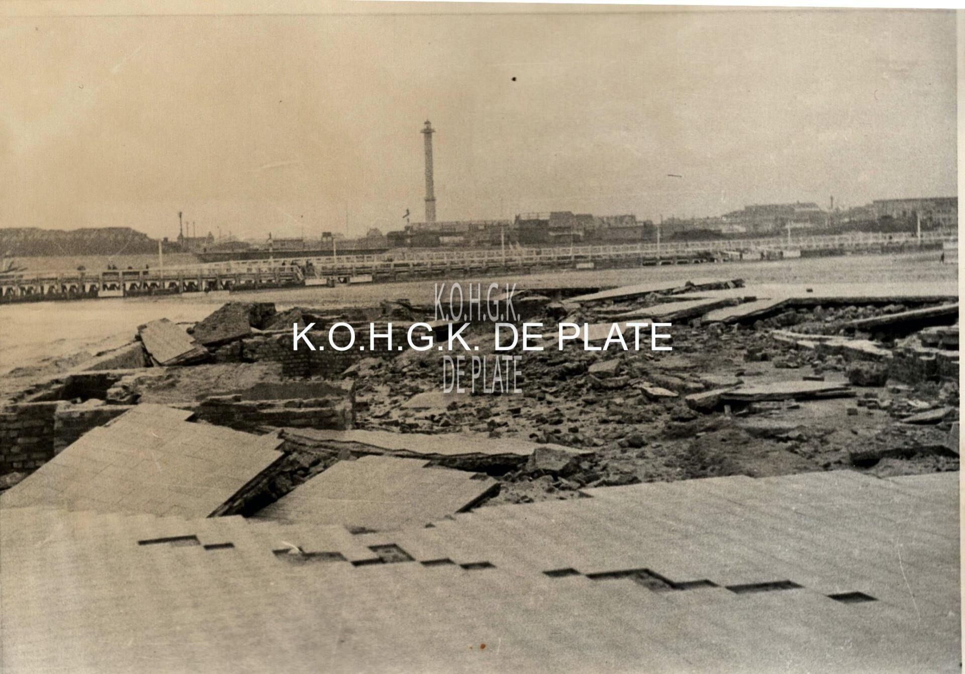 Formaat : 12,5 x 17 cm. - Een beschadigde Zeedijk met daarachter het Klein Strand en Weststaketsel. In de achtergrond een zicht op de Oosteroever met Vuurtoren Lange Nelle
