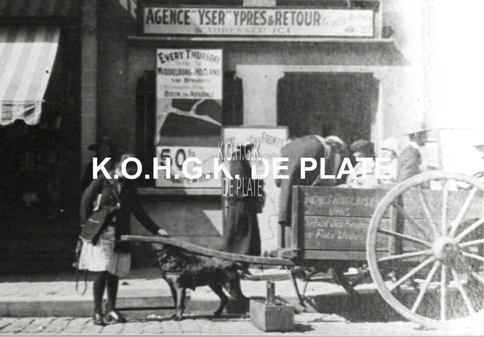 Formaat : 10 x 14 cm. - Verkoper van Engels bier en wijn, ook de hond moet werken en helpt de kar trekken. De kar staat voor "Agence Yser, Ypres & retour" dat uitstappen naar het front organiseert