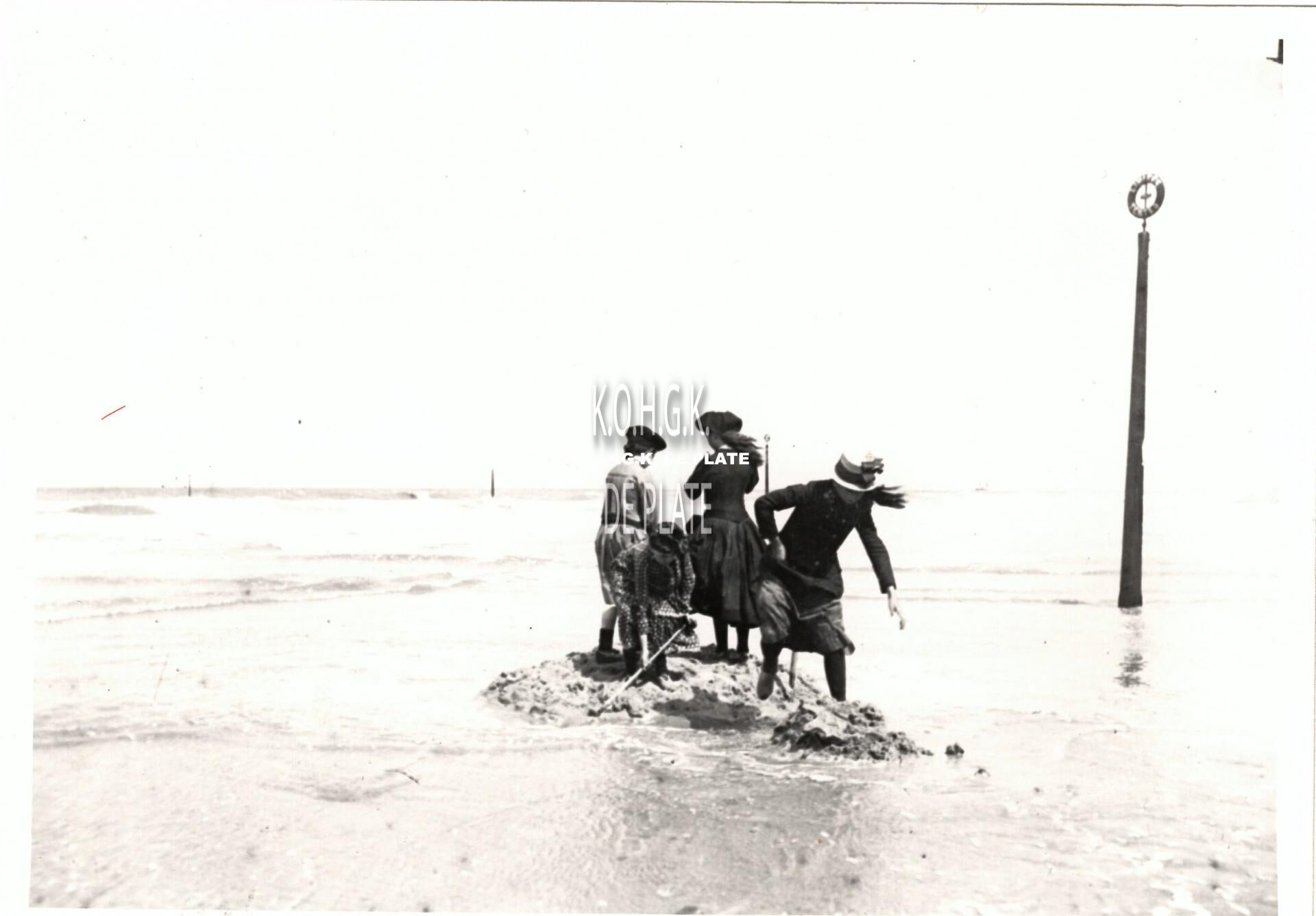 Formaat : 12,5 x 17,5 cm. - Na het bouwen van een "fort", of zandkasteel, was de strijd begonnen tegen het opkomend water. Afwachten wanneer de zee won. Tijdens de Belle Epoque nam men deel in zondagse kledij aan het strandgebeuren.