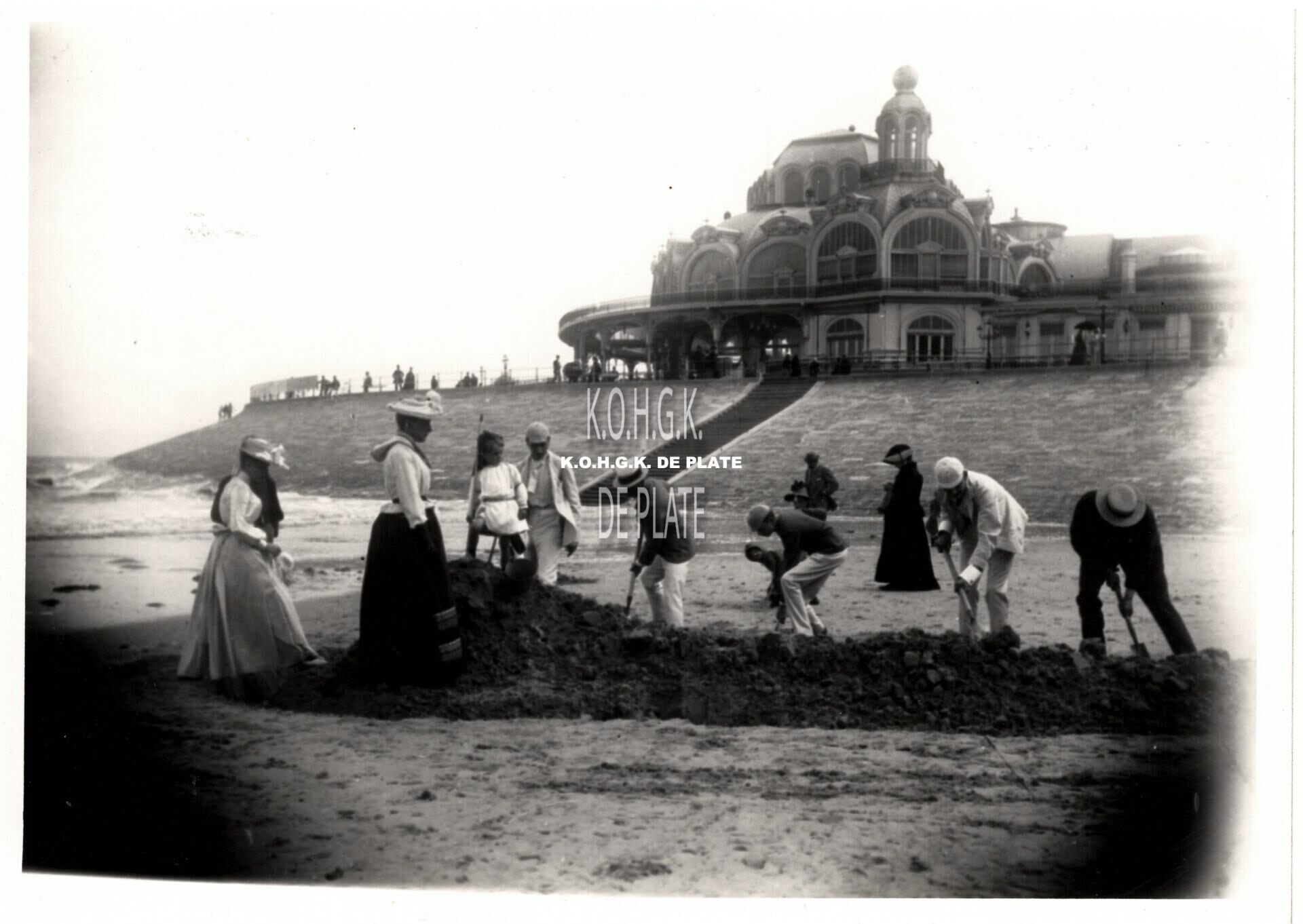 Formaat : 12,5 x 17,5 cm. - Een "fort", of zandkasteel bouwen op het Groot Strand tijdens de Belle Epoque. Ook volwassenen deden het. Op de achtergrond, een gedeelte van de westgevel van het tweede Kursaal langs de Zeedijk.