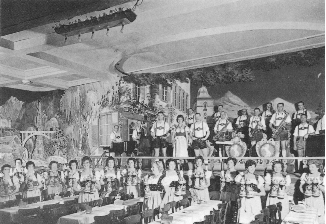 Feestzaal gelegen in de Van Iseghemlaan - hoek Hertstraat. Op het podium het orkest van Leo Martin. Hij staat rechts, naast de zangeres Chris Sent. Vooraan de opdiensters met hun grote stenen kruiken waar 1 tot ... liter(s) bier in kon.