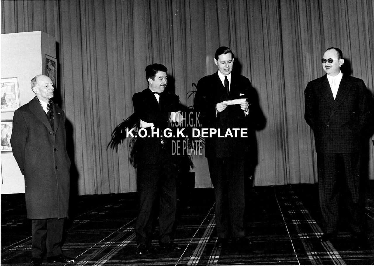Formaat : 13 x 18 cm. - Opening van de tentoonstelling op 1 april 1961 door burgemeester Jan Piers. Links naast hem, schepen Roger De Kinder en gemeenteraadslid Leo Porta. Rechts, Roger De Ramée, directeur van het Kursaal. De tentoonsteliing toonde een 300 affiches, een 20 oldtimers en ook fietsen uit de Belle Epoque. Uit de collectie van Wittamer (Brussel) en Mahy (Gent).