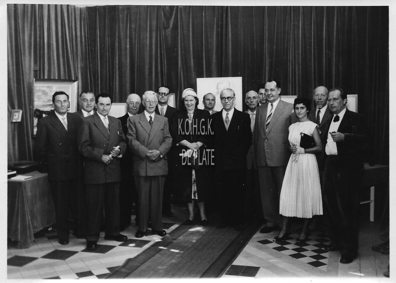 Formaat : 13 x 18 cm. - We herkennen o.a. van rechts naar links : Albert Hagers, Jules Albert Yde, mevrouw R. Henno, Charles Heilman, J. De Vijlder, Pierre-Nicolas Boel, mevrouw Heilman, René Lust, Maurice Vantournhout. Derde van links naar rechts, Léopold Baeys. - Map 006 A-109i
