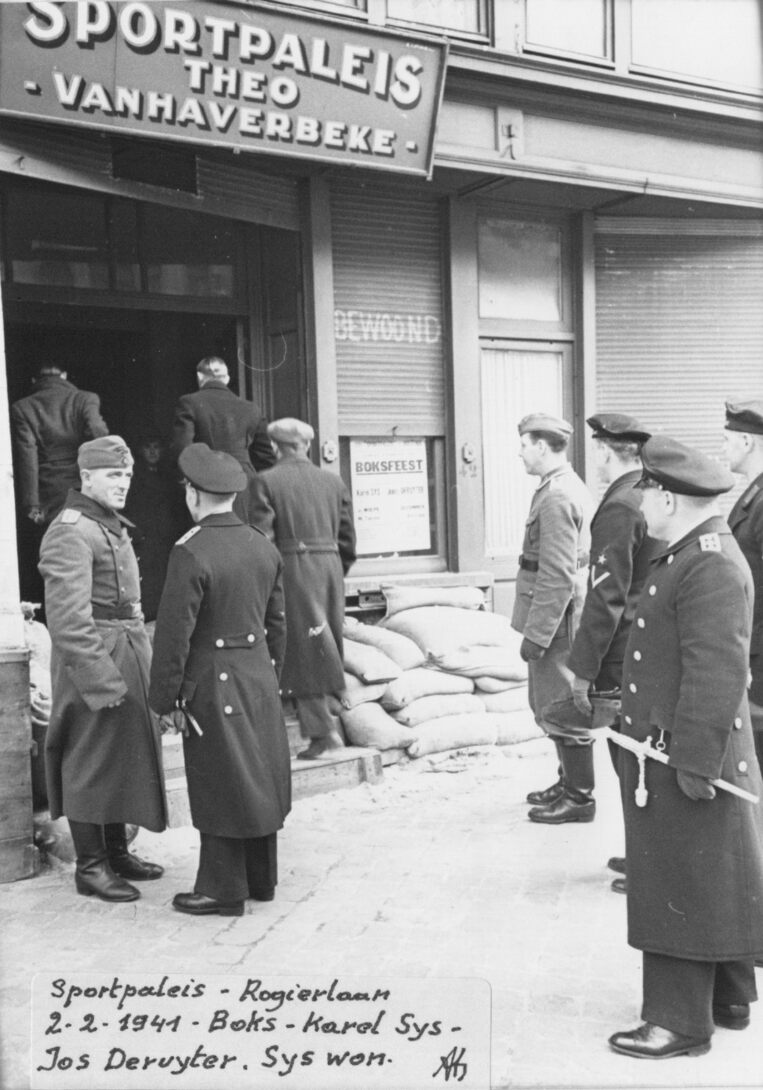 Duitse militairen voor de ingang van het "Sportpaleis Theo Vanhaverbeke" in de Rogierlaan. Bokskamp tussen Karel Sys en Jules (Jos) De Ruyter (Deruyter). Sys won de match in de categorie zwaargewicht. (coll. Ecpa)