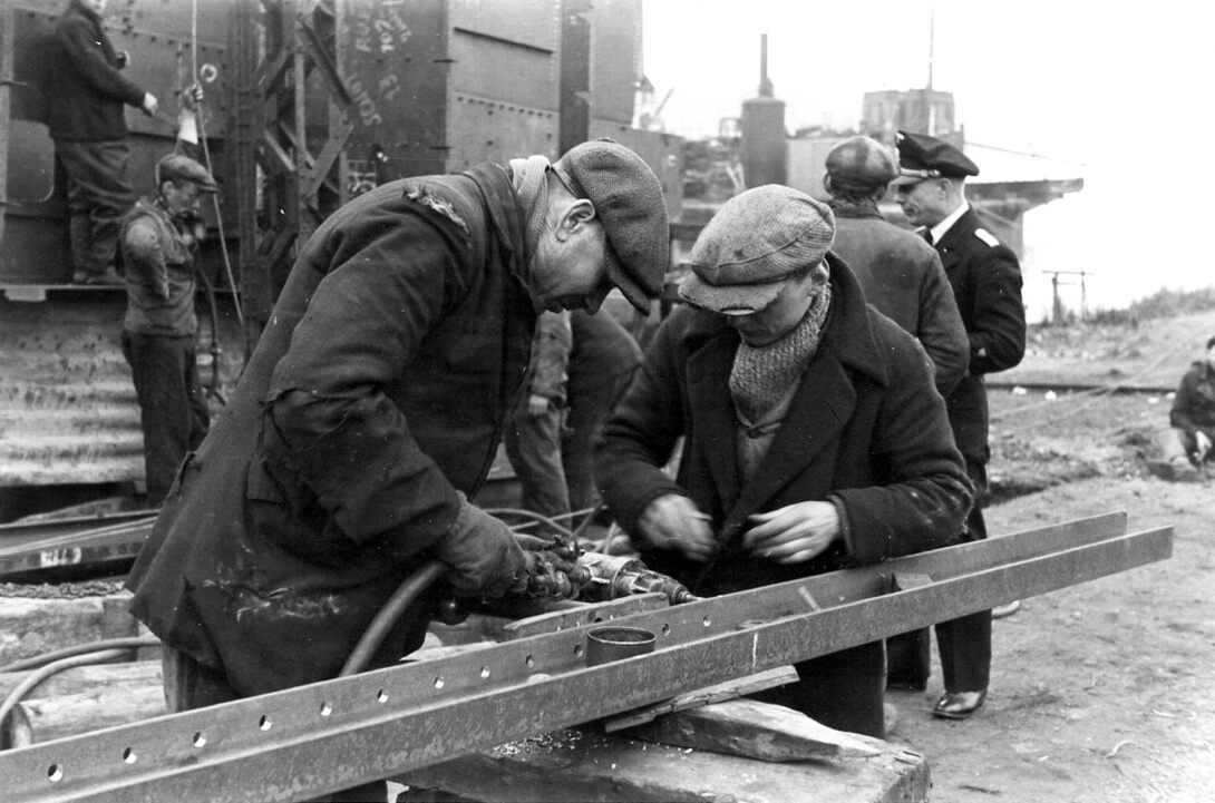 Bouw van "Marinefährprähm" voor de Kriegsmarine. Landingsboot van het type A. Lengte : 47,04 m. ; Breedte : 6,53 m. - (coll. Bundesarchiv)