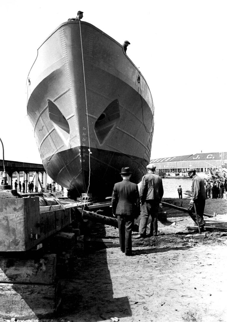 Stapelloop van een "Vorpostenboot" voor de Kriegsmarine. - (coll. Bundesarchiv)