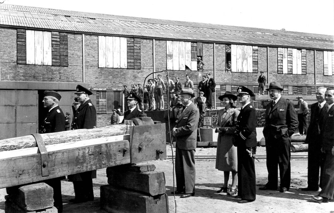 Stapelloop van een "Vorpostenboot" voor de Kriegsmarine, in opdracht van de Hamburgse werf "Norderwerft". Uiterst rechts, drie bestuurleden van Béliard-Crighton, de heren Williams, Fontaine en directeur Chardome. Op de achtergrond, de schrijnwerkerij. - (coll. Bundesarchiv)