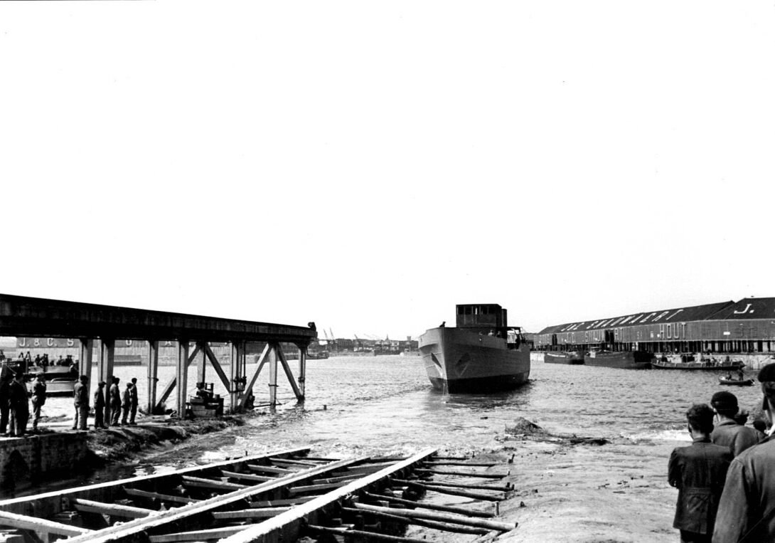 Stapelloop van een "Vorpostenboot" voor de Kriegsmarine. Op de achtergrond, de houthandel Snauwaert. - (coll. Bundesarchiv)