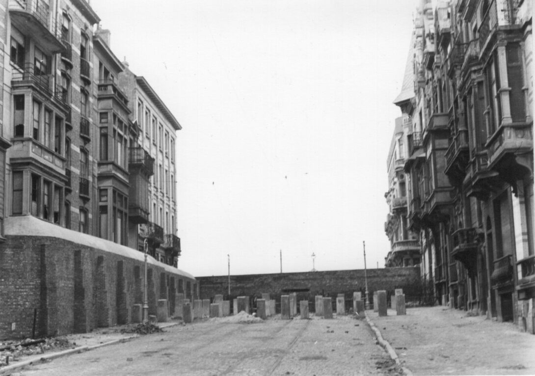 Anti tankmuur op het einde van de Van Iseghemlaan. Op het einde, links "Hotel du Casino" en rechts, "Royal Phare Hotel". (coll. Bundesarchiv)
