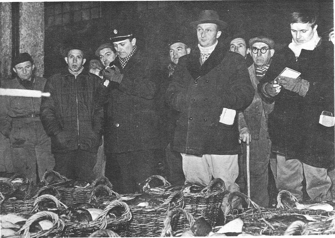 Verkoop van de vis. De afslager die de te koop aangeboden vis in afdalende reeks afroept en hem ten slotte aan de hoogst biedende verkoopt. Hij roept over welke vissoort, sortering en gewichten het gaat. Hij wordt bijgestaan door een schrijver en een tweede schrijver. Zij noteren de prijzen van de verkochte vis, de soort vis, de hoeveelheid en de koper. - Map 023 A-50