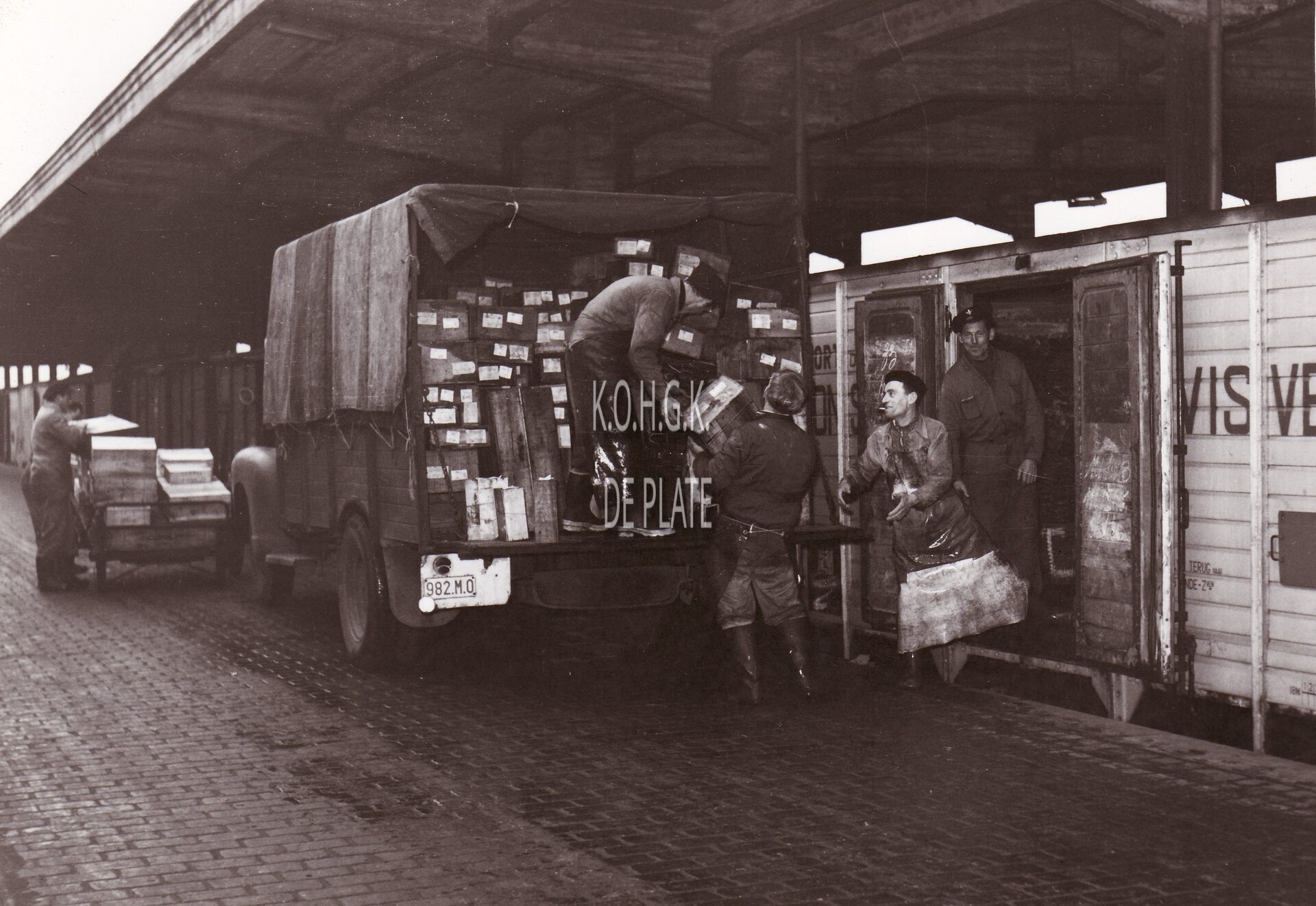 Formaat : 13 x 18 cm. - In de Vismijn worden kistjes vis ingeladen in een wagon van de vistrein voor transport naar het binnenland.