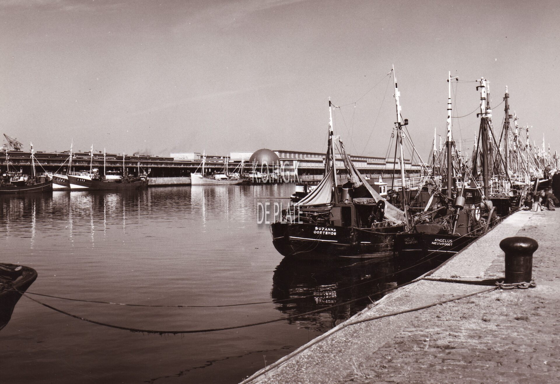 Formaat : 13 x 18 cm. - Vissersvaartuigen aangemeerd langs de Hendrik Baelskaai in het Visserijdok. In de achtergrond de vismijn en sprotmijn.