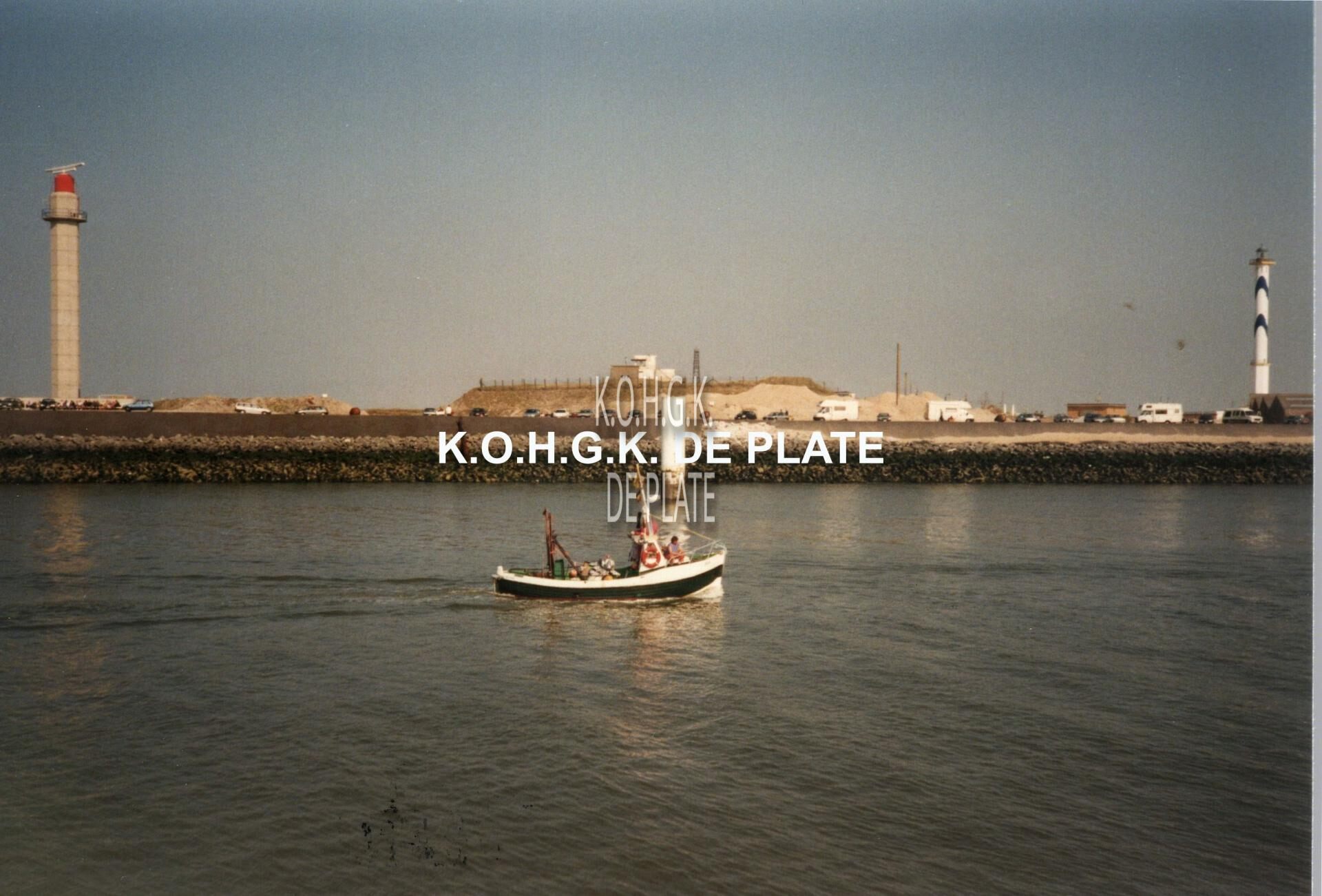 Formaat : 9 x 13 cm. - Een open vissersvaartuig in de havengeul. Zicht op de Oosteroever met links de oude radartoren aan de Halve Maan, afgebroken in september 2015 in het plan voor uitbreiding van de havengeul. De nieuwe radartoren staat op de kop van de oostelijke strekdam. Rechts, de vierde vuurtoren "Lange Nelle"