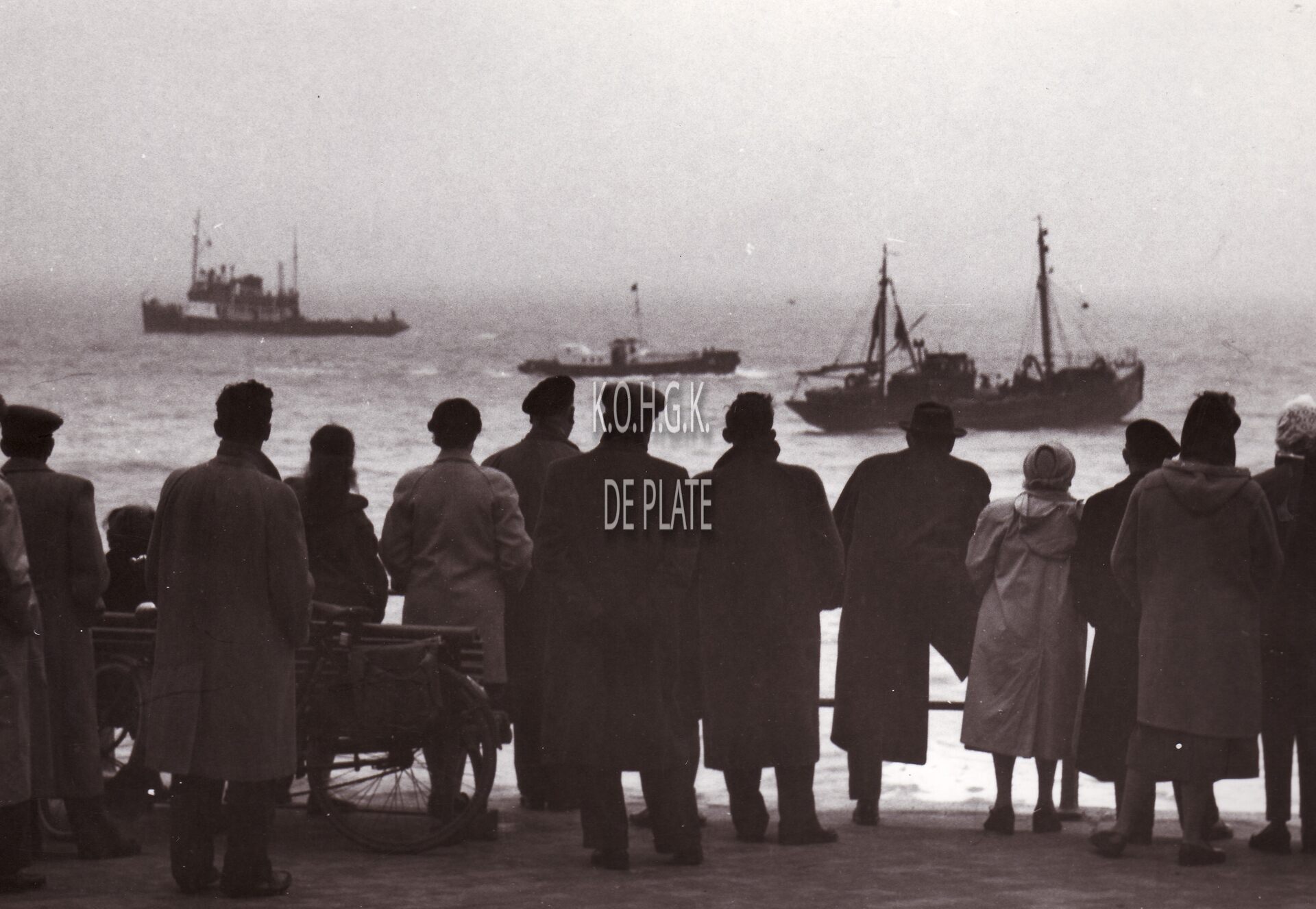 Formaat : 13 x 18 cm. - De O.276 Lucienne-Christiane wordt losgetrokken door de sleepboot Zeeleeuw, onder ruime belangstelling. Links, een sleepboot, in het midden een loodsboot. Het vissersvaartuig strandde op een golfbreker ter hoogte van Oostende in een dikke mist op 15 november 1955