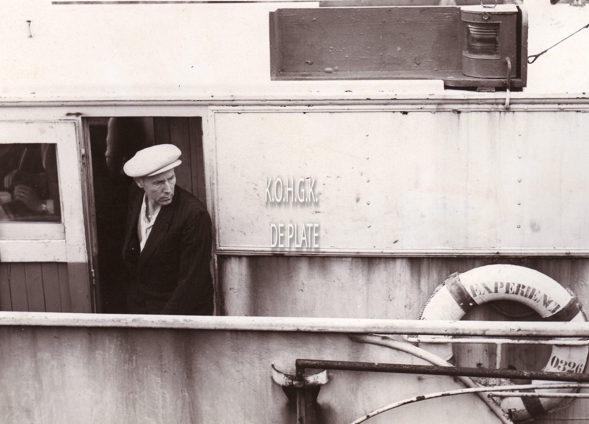 Formaat : 13 x 18 cm. - Een bemanningslid van de O.326 Experience aan boord van zijn schip.