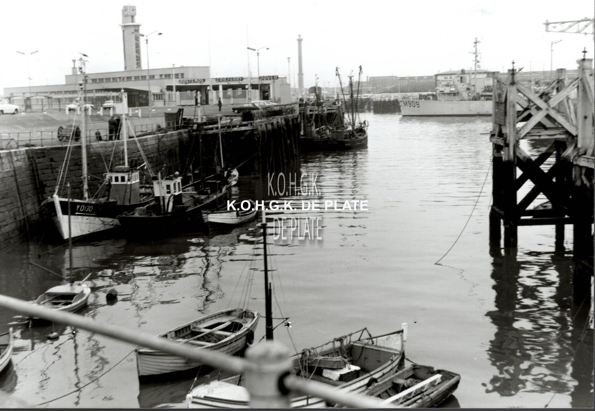 Formaat : 18 x 13 cm. - Enkele vissersvaartuigen in de Visserskreek. Links het Carferrygebouw en aan de overkant van de havengeul, de hoogzeemijnenveger M.909 "F. Bovesse"