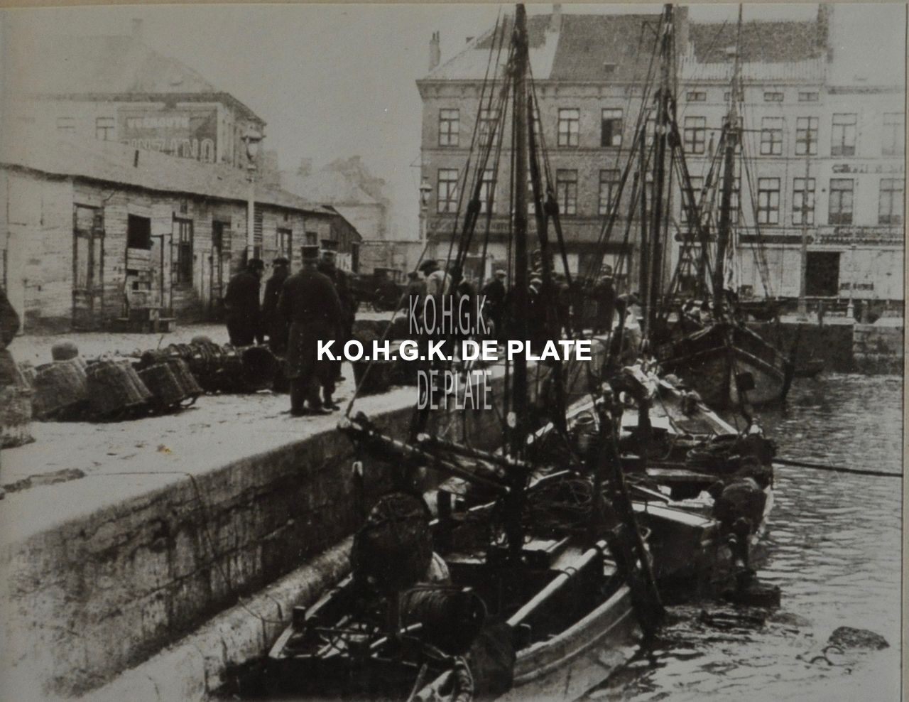 Foto van het Schuildok, nu Montgommerydok, met op de achtergrond de Visserskaai ter hoogte van de Sint-Paulusstraat en op de links de garnaalmijn. Op de voorgrond een drietal vissersschepen.