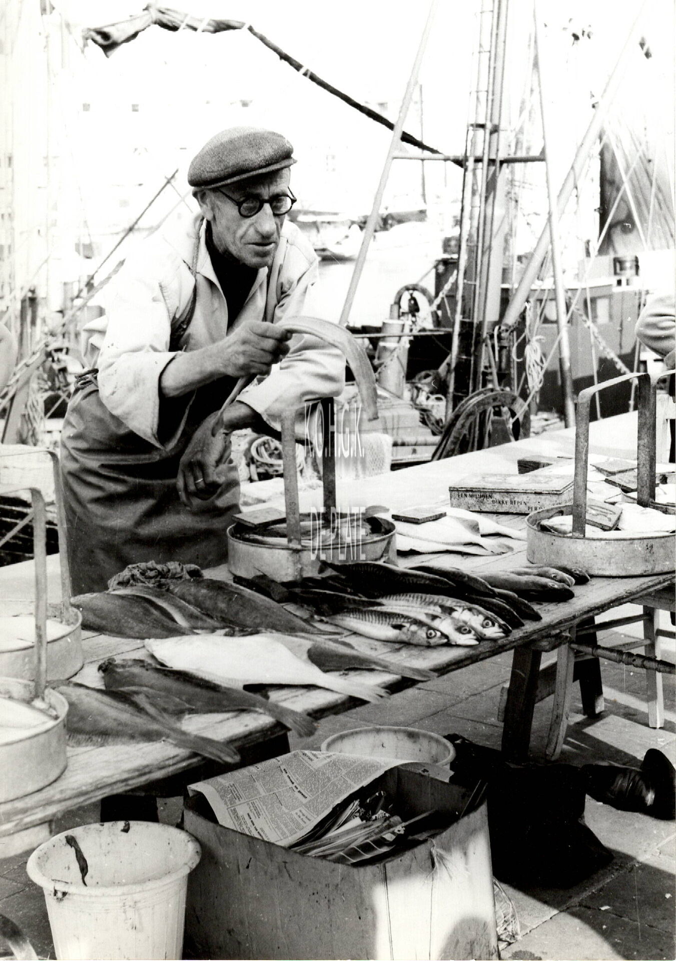 Formaat : 18 x 13 cm. - Verkoop van verse vis op de Visserskaai door een visser. Let erop, de visser verkoopt ook vis in een zeef. Hij verkoopt de vis in een zichte, dit wil ook duiden dat het juiste gewicht niet bepaald is. Hij legt daarop wel een prijskaart maar je kan nog altijd bieden hoeveel je voor zijn zichte, of zeef met vis, geeft. Die manier van verkopen aan de vistrap langs de Visserskaai is nu nog altijd in gebruik.