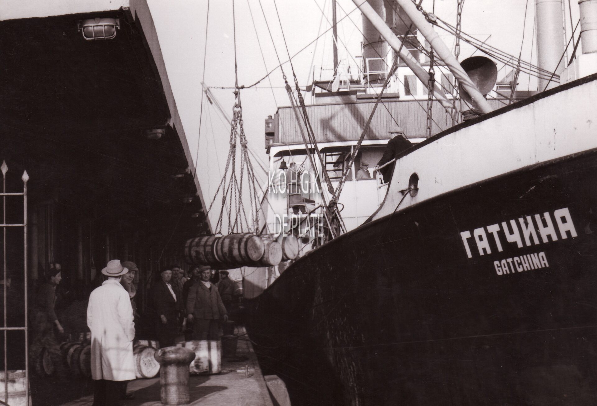 Formaat : 13 x 18 cm. - Het vrachtschip Gatchina wordt geladen aan de Vismijn met tonnen ingelegde vis.