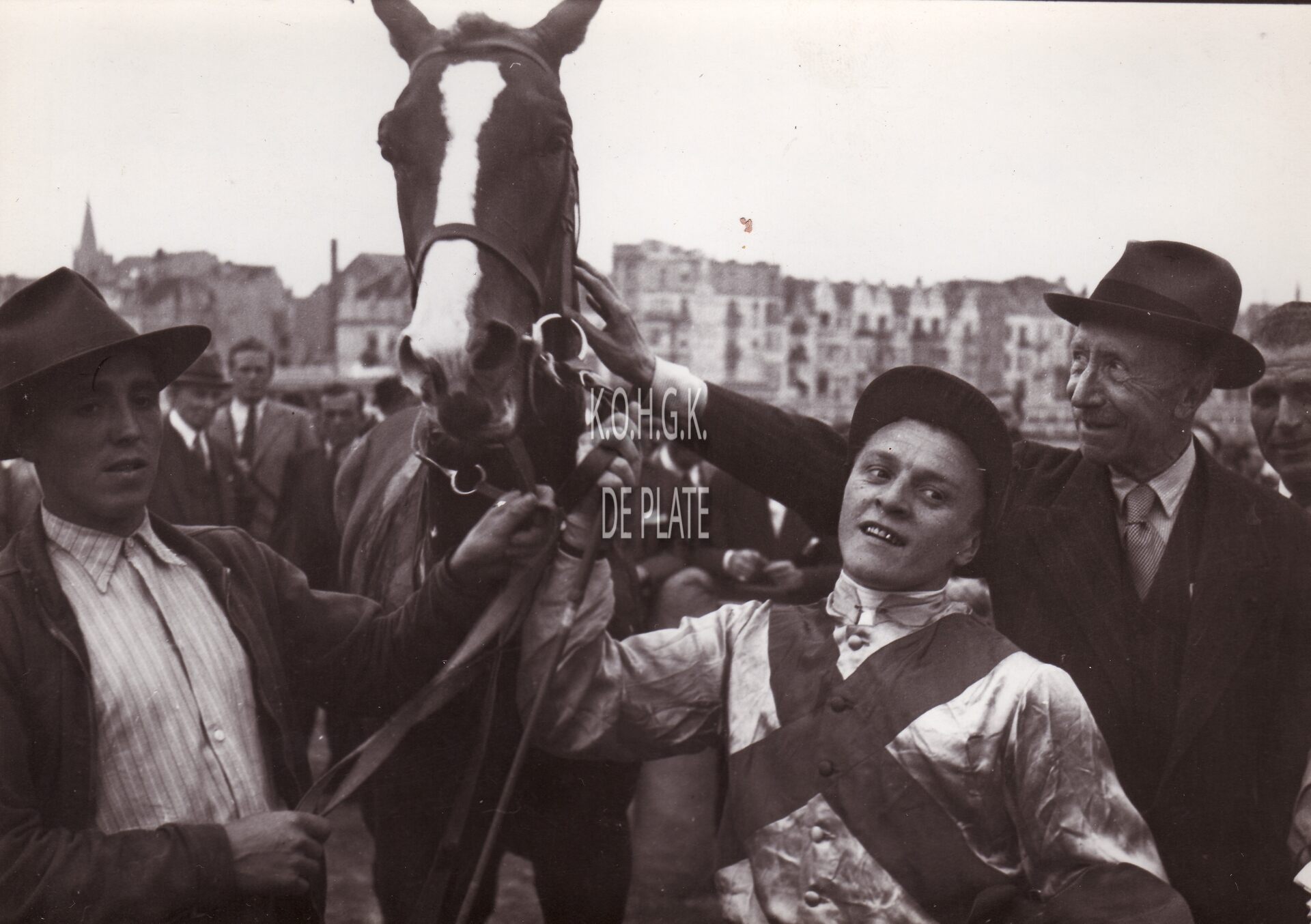 Fprùaat : 13 x 18 cm. - De winnende jockey en zijn paard Chicaneur op een der eerste koersdagen op de Wellingtonrenbaan na de Tweede Wereldoorlog.