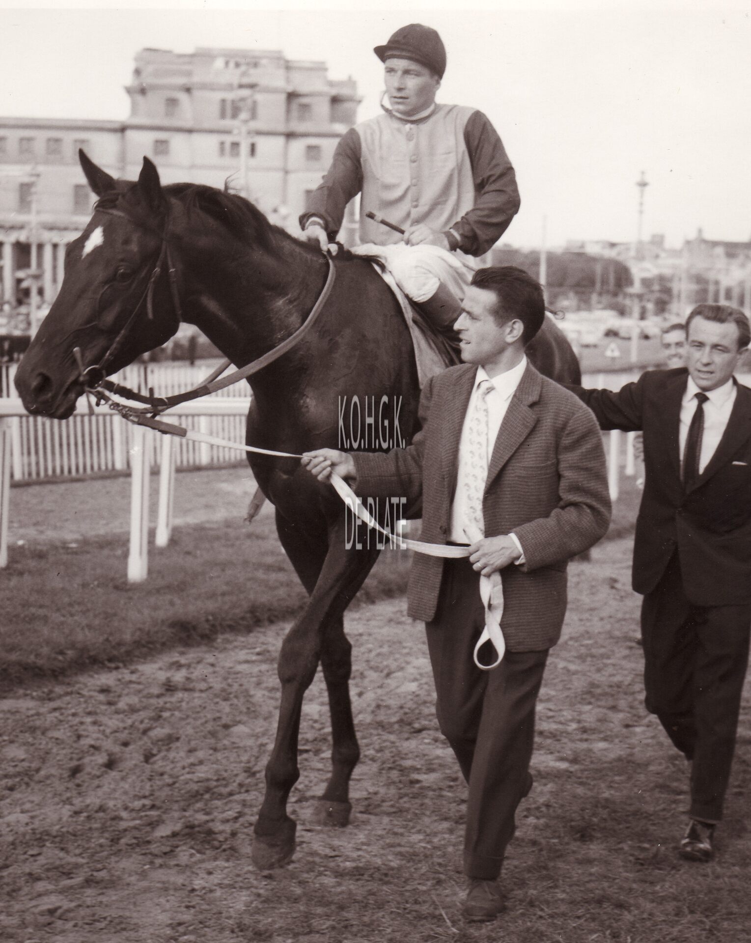 Formaat : 18 x 13 cm. - Jockey met paard en eigenaar in de paddock