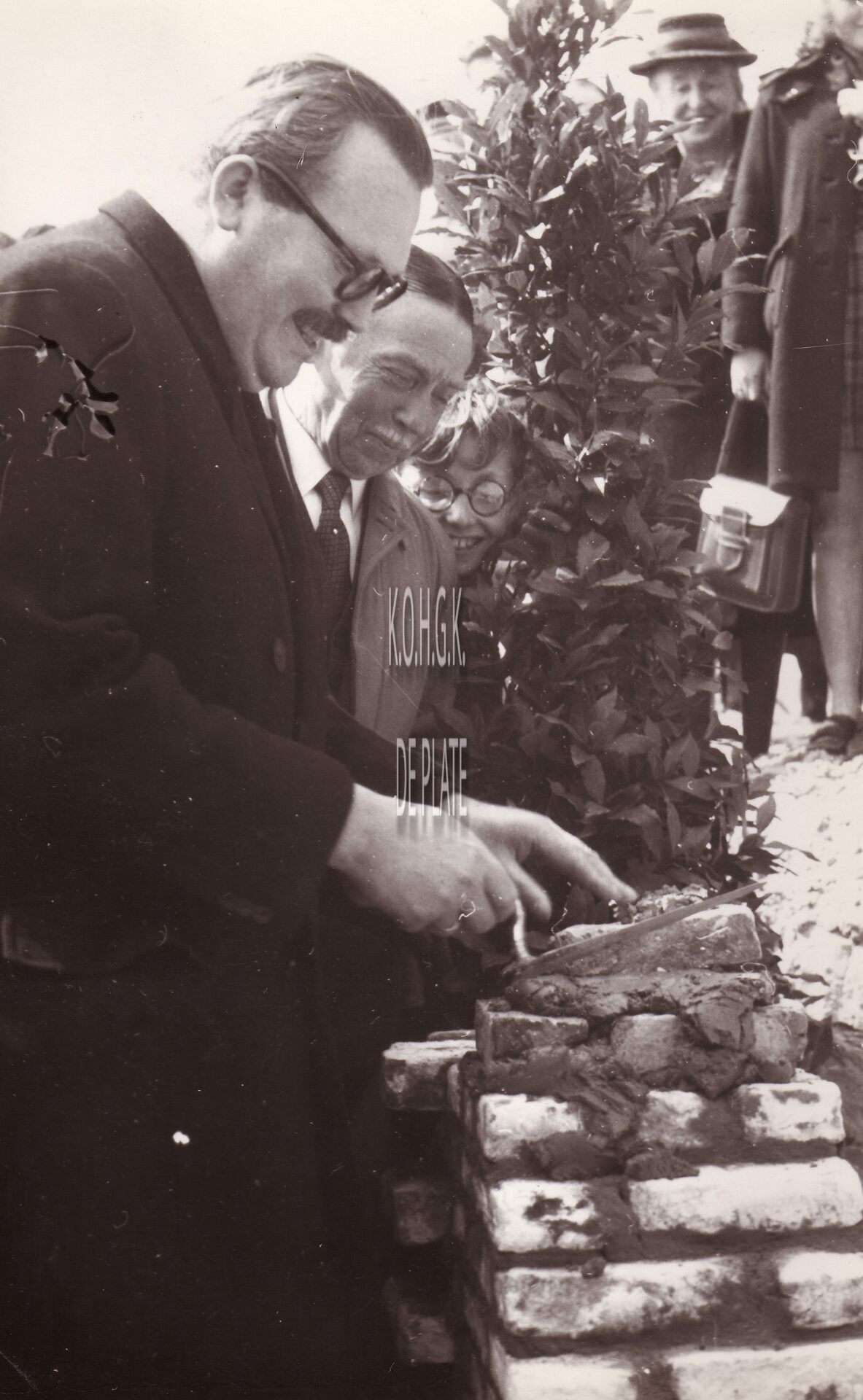 Formaat : 18 x 13 cm. - Heropbouw van de renbaan na de Tweede Wereldoorlog. Eerste minister Achiel Van Acker legt de eerste steen in aanwezigheid van burgemeester Henri Serruys