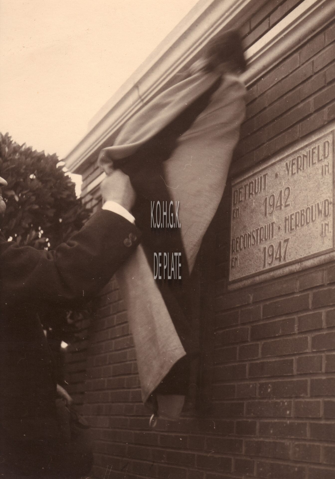 Formaat : 18 x 13 cm. - Gedenksteen voor de heropbouw van de Wellingtonrenbaan na de Tweede Wereldoorlog. De Tweede Wereldoorlog betekent een tijdelijke stop van de paardenrennen. Het terrein wordt aanvankelijk deels benut door het "Het nationaal werk van de akker". Echter in 1942 door de Duitsers omgevormd tot mijnenveld. Ook de tribunes worden vernield. Naoorlogse wederopbouw en bloei te danken aan Baron Vaxelaire, M. Bauwens en voornamelijk M. Dugniolle. Na ontmijning van de gronden, herstel van de piste en bouw van de omheining. Op 11 april 1947 eerste steenlegging van de nieuwe tribune