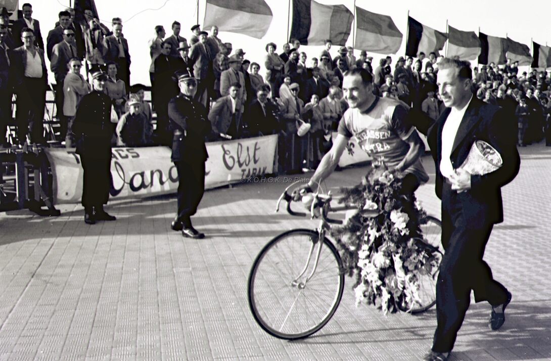 De winnaar van de 3e Grote Prijs der Kursaal 1954 Omer BRAEKEVELT, doet een ereronde op de Albert I Promenade. Tweede werd Leon VAN DAELE en derde Roger DECOCK.