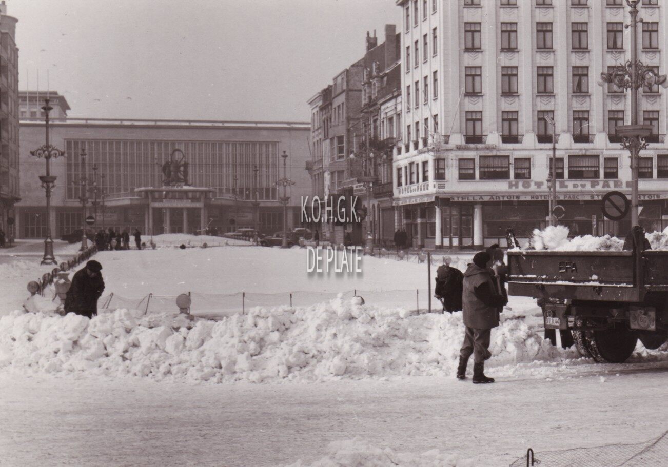 Formaat : 13 x 18 cm. - Stadswerklieden ruimen sneeuw op de Leopold II laan. Rechts het Marie- Joseplein met op de hoek Hotel du Parc. In de achtergrond het kursaal