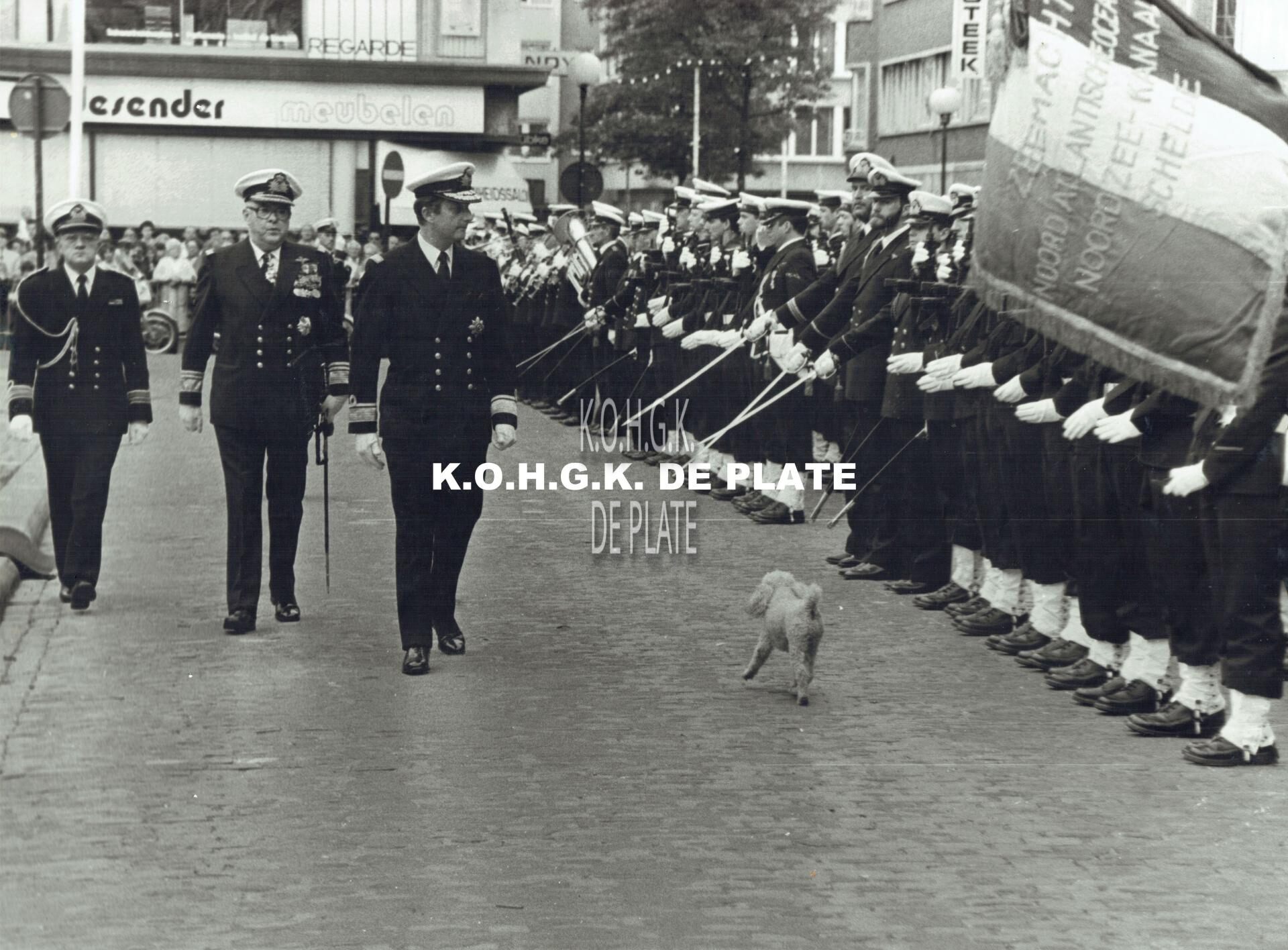 Formaat : 30 x 42 cm. - Prins Albert schouwt de troepen op het Wapenplein. V.l.n.r. : Fregatkapitein Pauwels, Vice-Admiraal Schlim en Prins Albert. Een kleine poedel is ook van de partij.