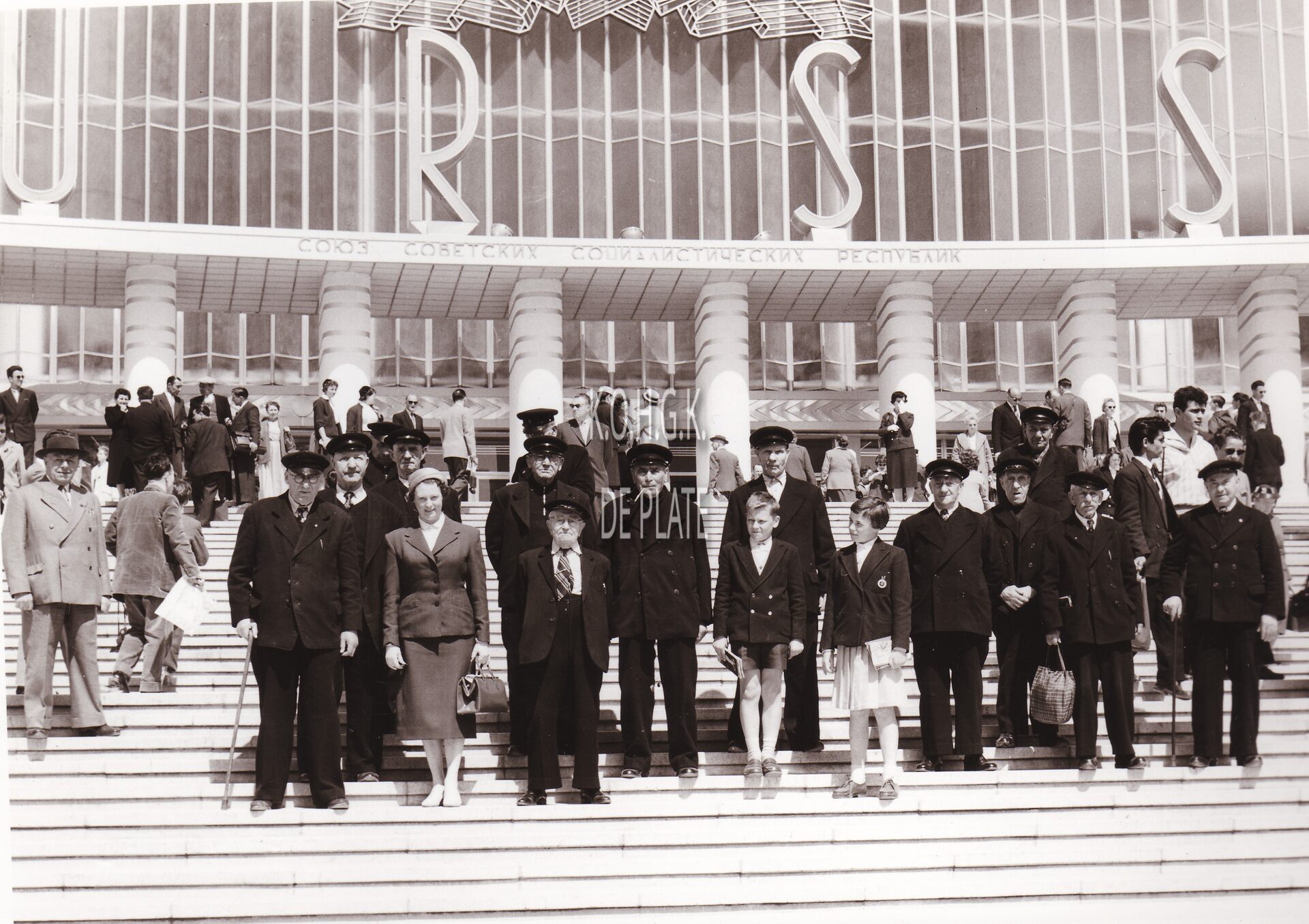 Formaat : 13 x 18 cm. Een groep bewoners van Godtschalck met hun directrice op de wereldtentoonstelling 1958 voor het paviljoen van de Sovjet-Unie.