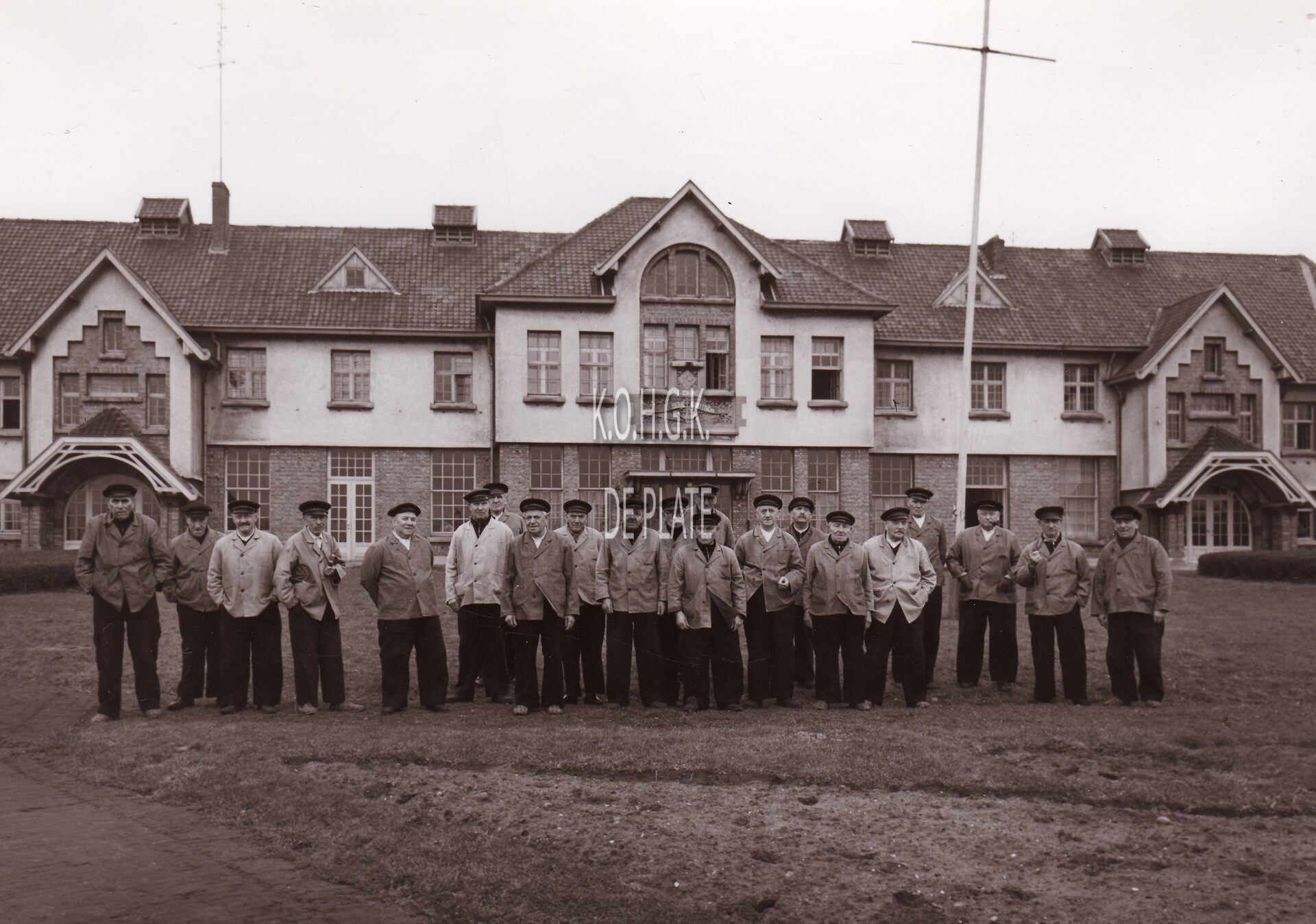 Formaat : 13 x 18 cm. - Zeemanshuis Godtschalck gelegen aan de Dr. E. Moreuxlaan 322, we zien een groep oude vissers voor de ingang die er toen verbleven.