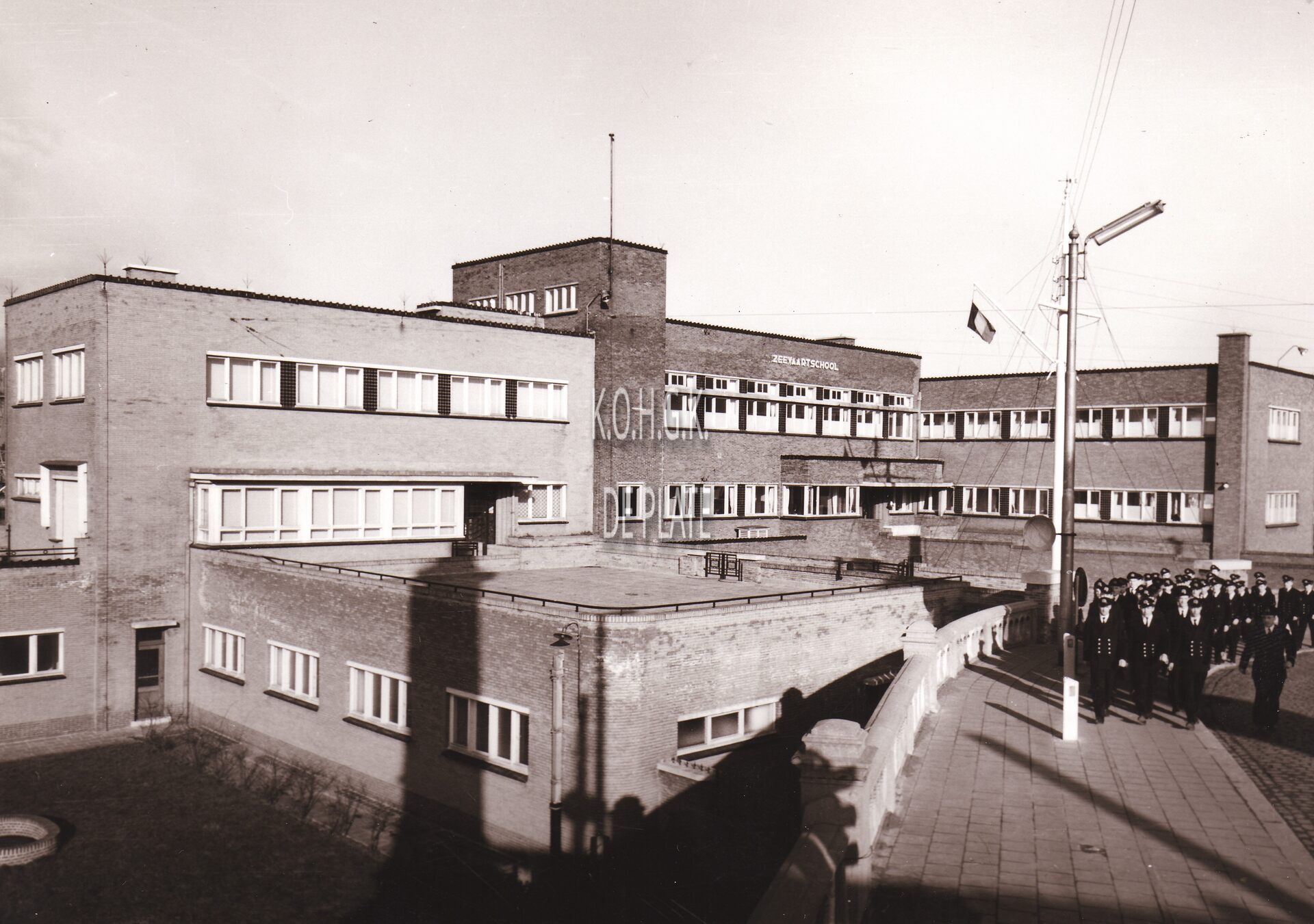 Formaat : 13 x 18 cm. - De Zeevaartschool aan de Slijkensesteenweg. De leerlingen marcheren naar een of andere plechtigheid.