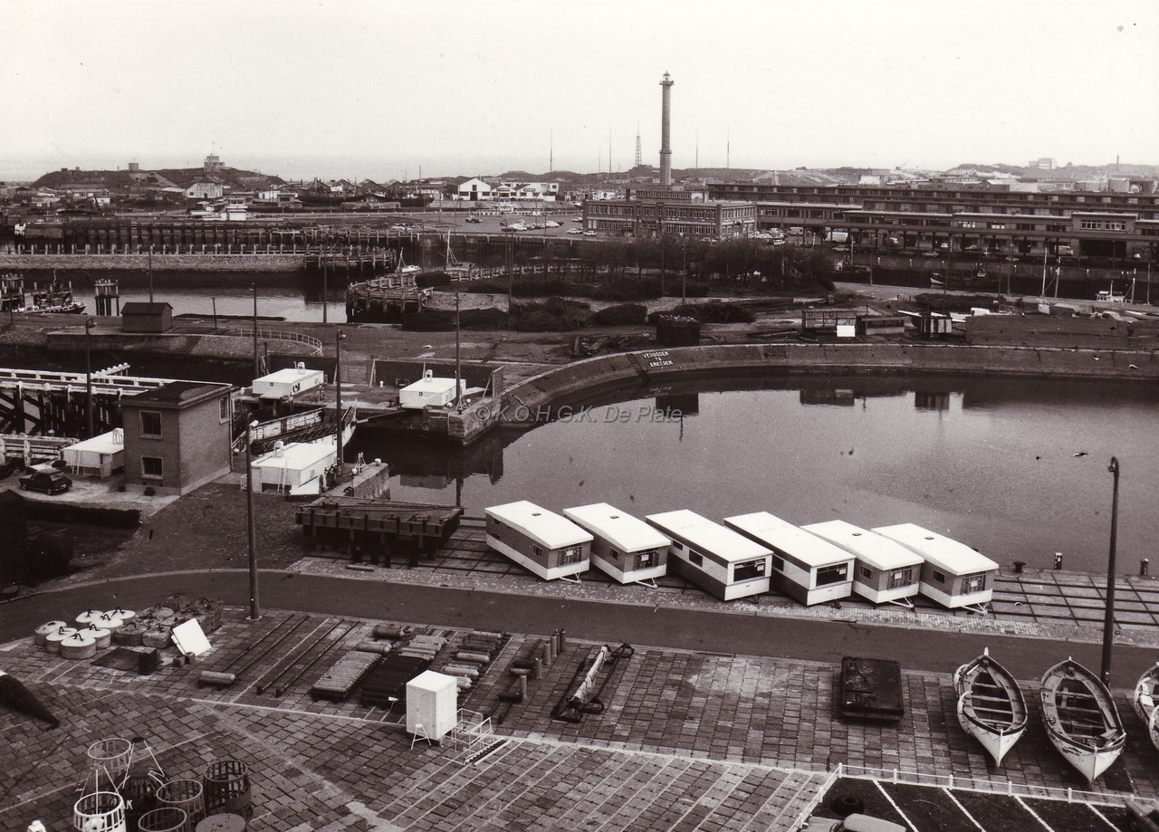 Zicht op het Zeewezendok met links de sluis vanop een werkhuis van het Bestuur van het Zeewezen op de Oosteroever. De toegangssluis was een enkelvoudige sluis zonder sas en werd in 1997 gesloopt. Rechts op de achtergrond de vismijn en de vismijnkantine. In het midden de vuurtoren "Lange Nelle". Links de militaire bouwwerken op de "Halve Maan"
