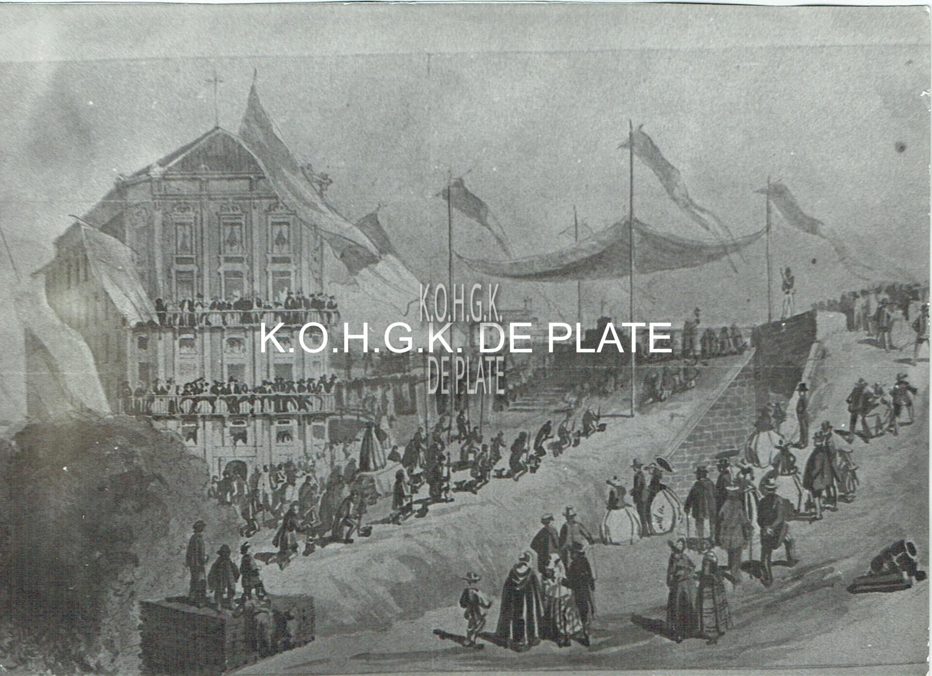 Afdruk. - Formaat : 13 x 18 cm. - Zicht vanuit wat nu de Hofstraat is. Het gebouw is een hotel op de hoek van de Spanjaardstraat en de Kapucijnenstraat en de (nog niet bestaande) Van Iseghemlaan. De met stenen afgeboorde doorgang rechts is de Hulppoort, die lag in werkelijkheid verder weg van het hotel.
