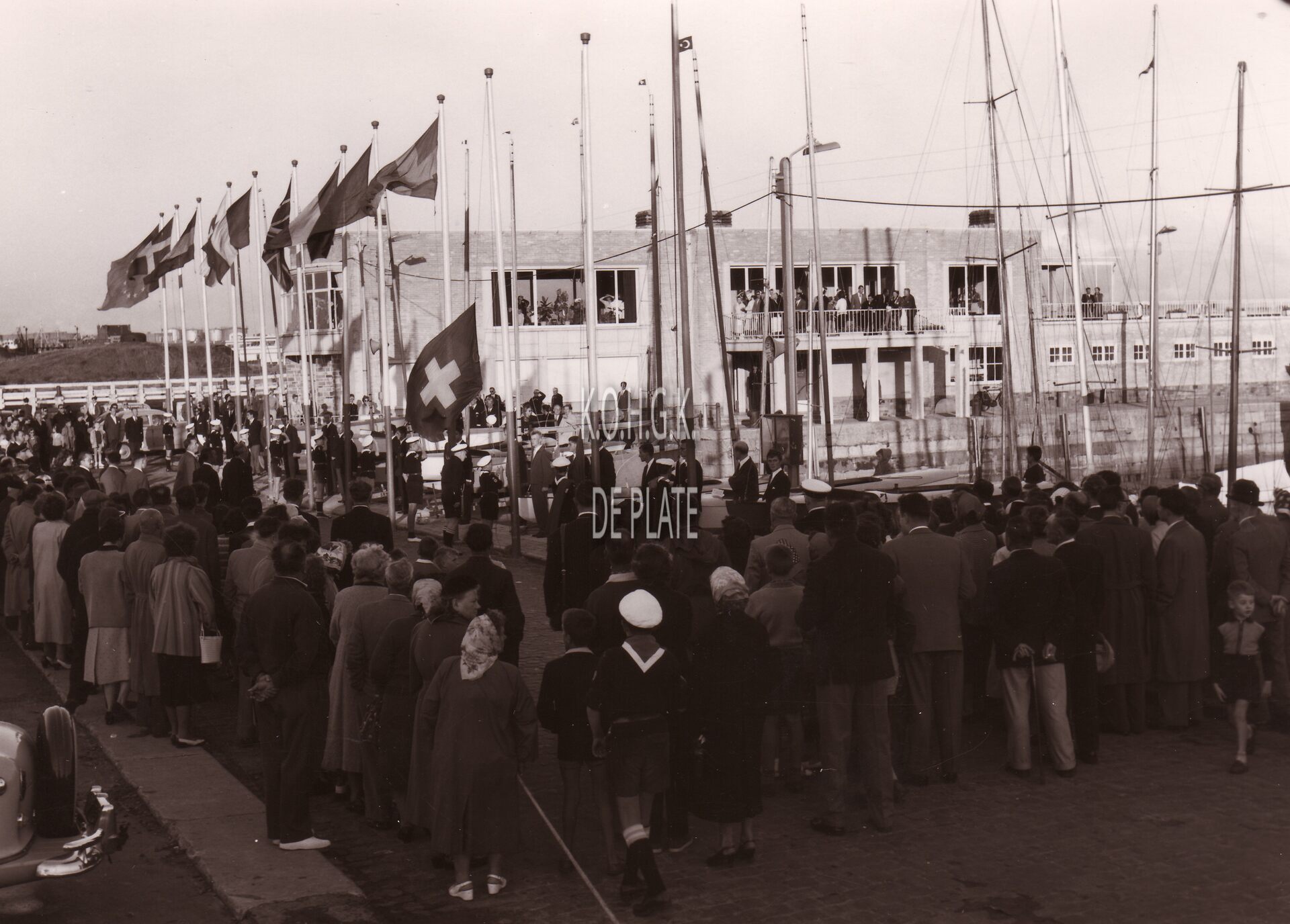 Formaat : 13 x 18 cm. - De vlaggen van de deelnemende landen aan een zeilwedstrijd worden gehesen aan het gebouw van de North Sea Yacht Club langs de Montgomerykaai.