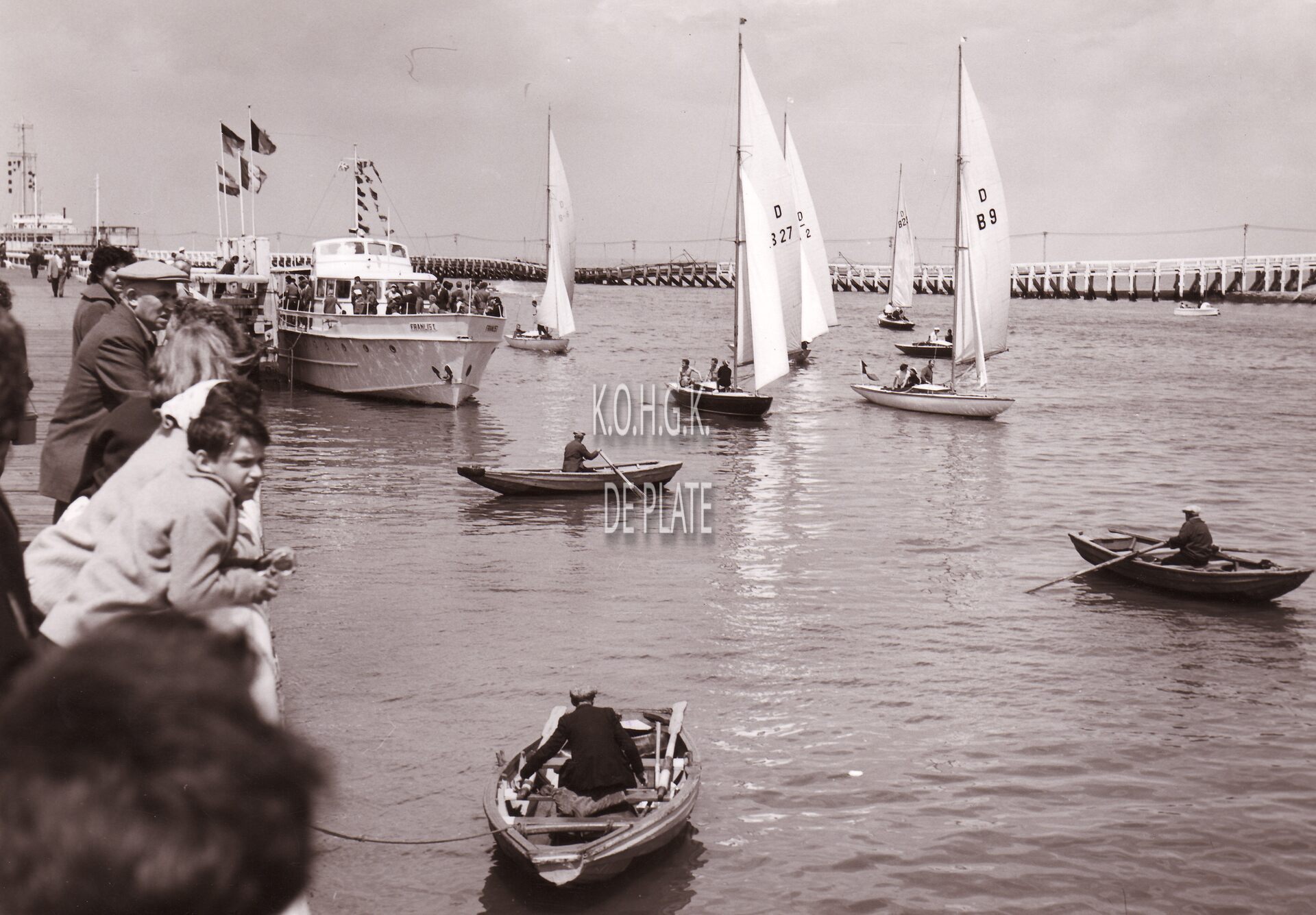 Formaat : 13 x 18 cm. - Deelnemers aan een zeilwedstrijd lopen terug de haven binnen. De Franlis I ligt aan het Weststaketsel. Op de voorgrond drie bootjesroeiers, meestal gewezen vissers, die de mensen overzetten naar de andere kant van de havengeul.